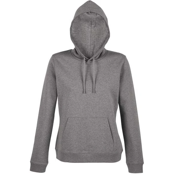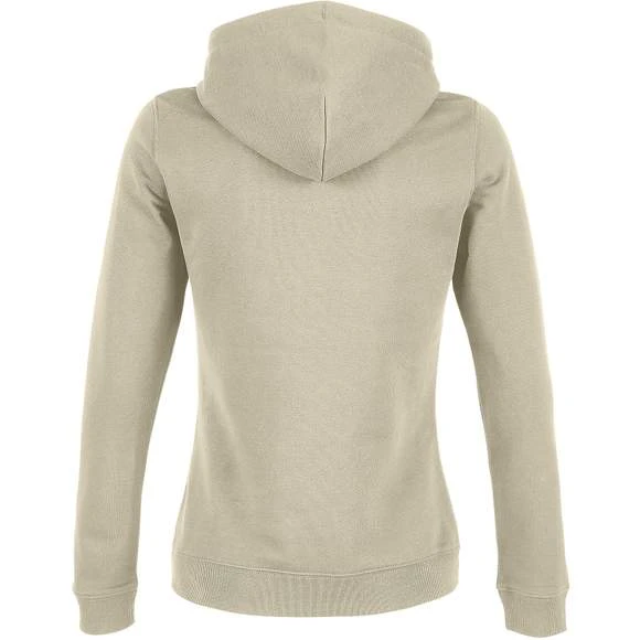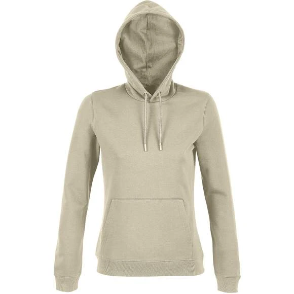 Sweat-shirt à capuche pour femme. Modèle avec poche kangourou, capuche et cordons de serrage. Oeillets et embouts assortis à la couleur du textile. Doublure en Jersey. Finitions en bord-côte 2×2 au niveau des poignets et de la base. Demi lune et bande de propreté à l’interieur du col. Matière French Terry. Composition 85% coton peigné et 15% polyester. Grammage : 400g/m²