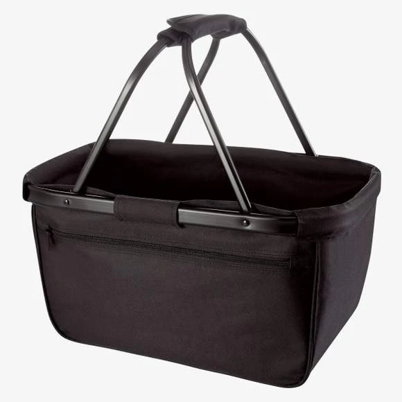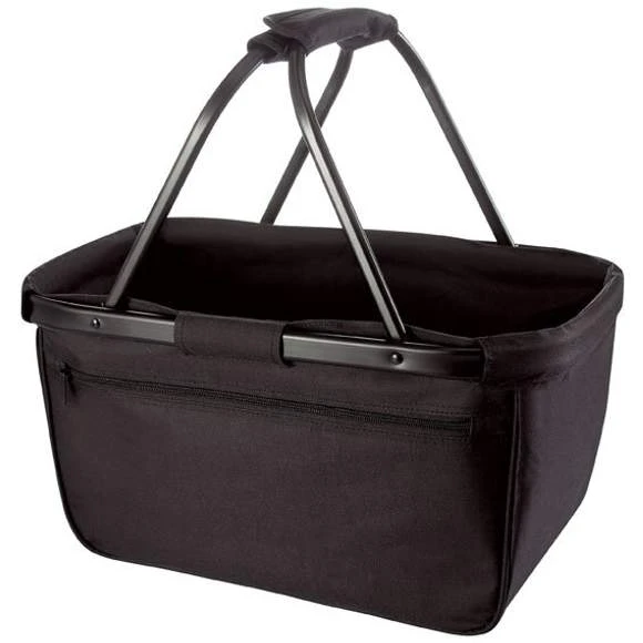 Panier de courses pliable , armature en aluminium, poche zippée à l’avant. Polyester 600D. Dimensions : L : 45 , H : 25/45 , P : 25 cm.