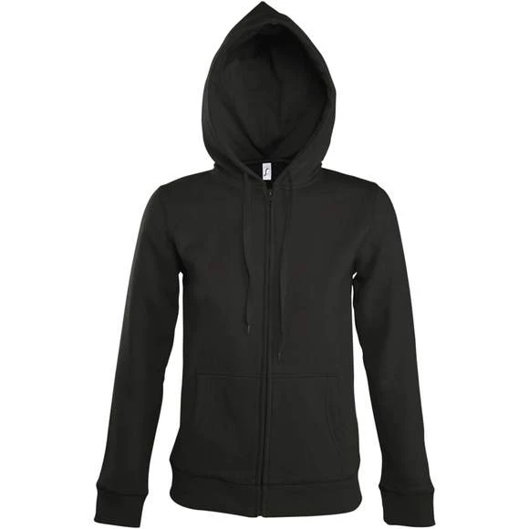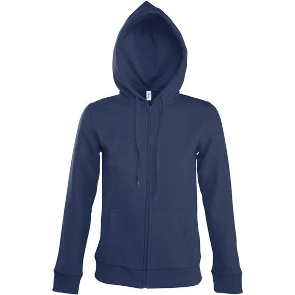 Veste zippée femme à capuche doublée – Molleton 290 • 50% coton 50% polyester • Intérieur en molleton gratté – Manches montées • 2 poches kangourou • Bas et poignets en bord côte élasthanne • Capuche doublée avec cordon de serrage ton sur ton • Coupe ajustée Grammage : 290g/m²