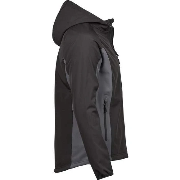 ·290 – 300 g/m² ·95% polyester, 5% spandex ·softshell 3 couches avec membrane TJtech ·résiste au vent et waterproof (6.000 mm) ·respirant ·capuche réglable ·fermeture à glissière YKK et rabat tempête intérieur ·manches raglan ·poche avec fermeture à glissière sur la manche ·poches à glissière profondes sur le devant ·poignets et base ajustables Grammage : 290g/m²
