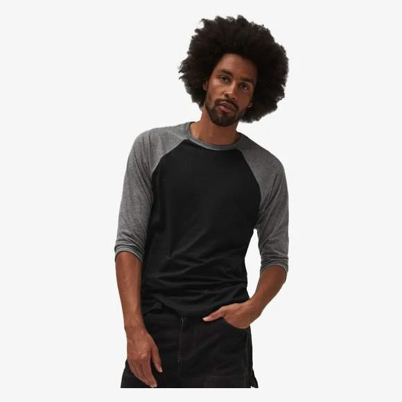 50% polyester / 25% coton ring-spun peigné / 25% rayon. T-shirt Baseball avec encolure et manches 3/4 raglan contrastés. Matière mélange « Triblend ». Coupe ajustée. Grammage : 115g/m²
