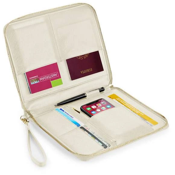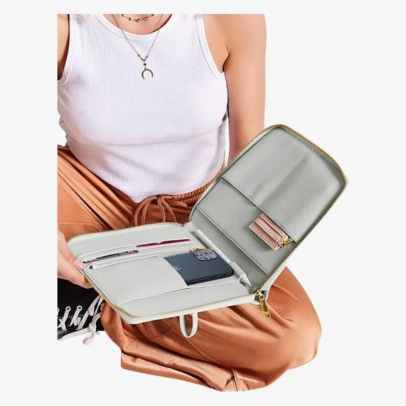 Pochette pour accessoires électroniques. Doublure douce au toucher. Compartiment principal à fermeture zippée. Multiples poches internes. Peut contenir 6 cartes de crédit. Compatible avec iPad mini/tablette. Étiquette TearAway. Dimensions : 20 x 23 cm. Composition : 100% Polyuréthane (similicuir Saffiano grain fin).