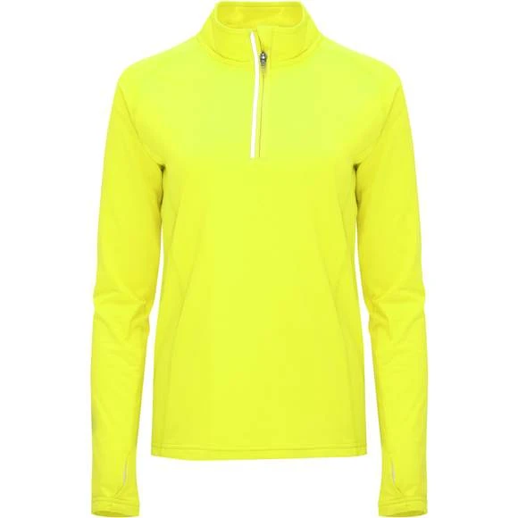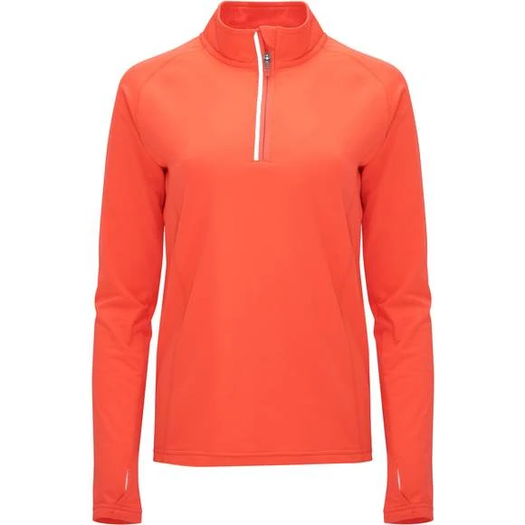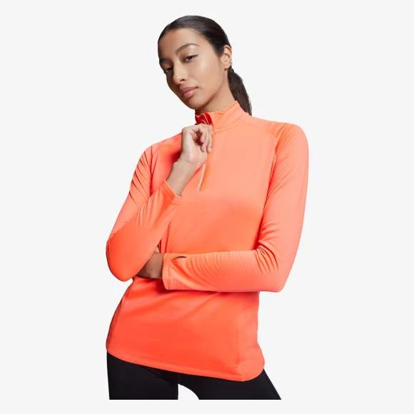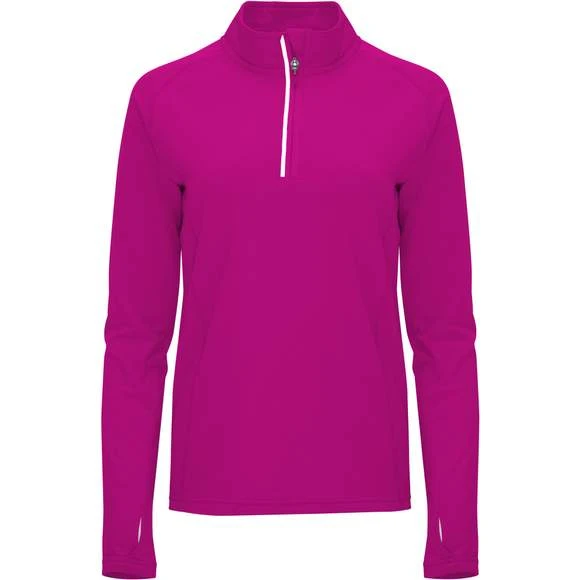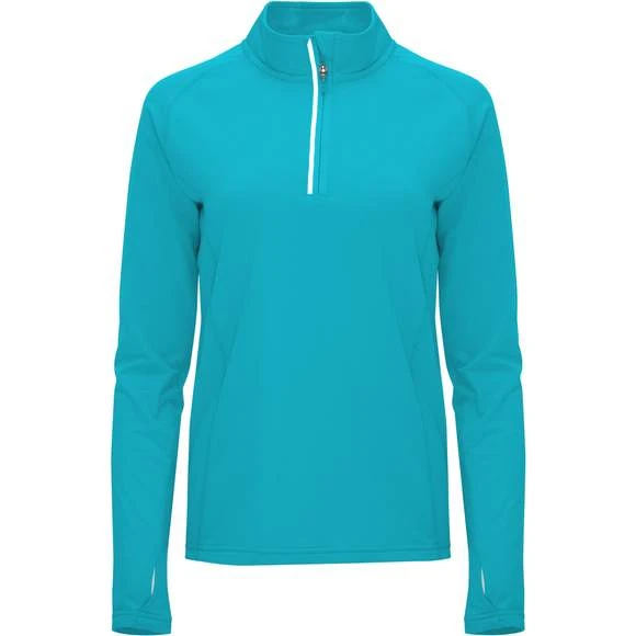 Sweat technique manches longues raglan pour femme. Intérieur gratté. Bande de propreté renforcée et contrastée à l´intérieur du cou. Demi zip inversé ton sur ton avec détail réfléchissant. Poignet avec ouverture pour le pouce. Le dos est légèrement plus long que le devant. Détail réfléchissant dans le dos. Composition : 94% polyester /6% Elasthanne. Grammage : 200g/m²