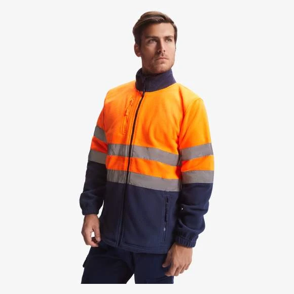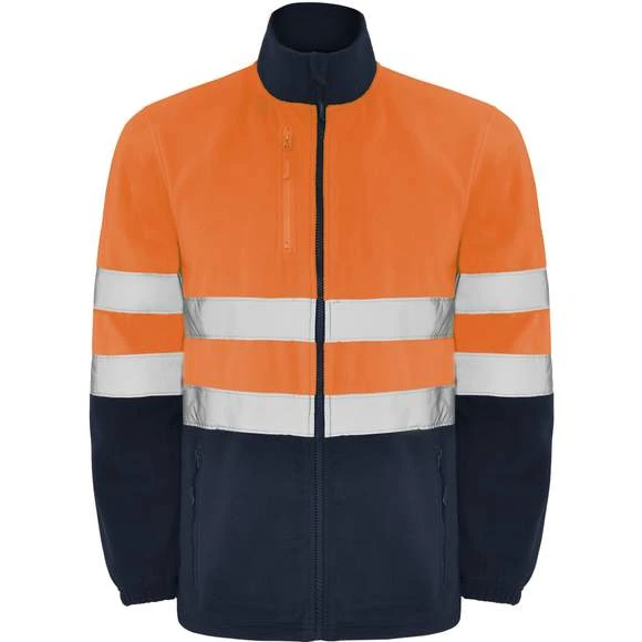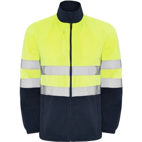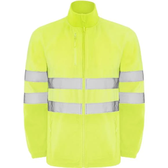 Veste style polaire haute visibilité. Zip avant avec protège-menton. Deux bandes réfléchissantes horizontales sur la poitrine et les manches. Deux poches avant avec zip ton sur ton et une poche sur la poitrine. Poignets élastiques et stoppeurs à l´intérieur du bas. Certification CE selon les normes : UNE-EN ISO 13688: 2013 et UNE-EN ISO 20471: 2013. Classe II. Haute visibilité. Modèle coupe-vent. Composition : 100% polyester micropolaire. Grammage : 300g/m²