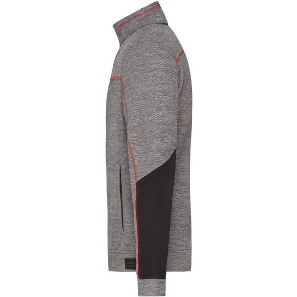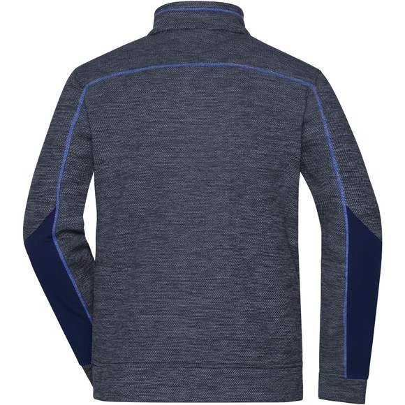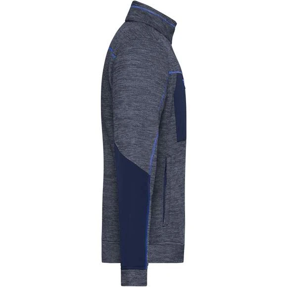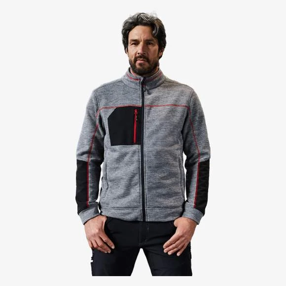 Veste en polaire tricotée facile d’entretien pour le travail et les loisirs. Tissu doux, chaud et facile d’entretien, d’aspect chiné. Extérieur d’aspect lisse et texturé, Intérieur souple, pelucheux et brossé. Possède deux poches latérales avec fermeture zippée dissimulée, deux poches intérieures, une poche poitrine en tissu tissé avec fermeture zippée contrastée. Coutures contrastées. Col montant. Fermeture zippée dissimulée sur toute la longueur avec protection du menton. Composition : 100% polyester dont 80 % recyclé. Grammage : 230g/m²