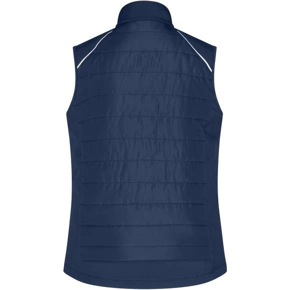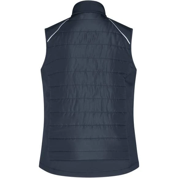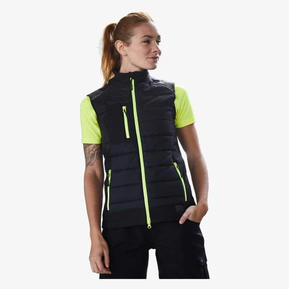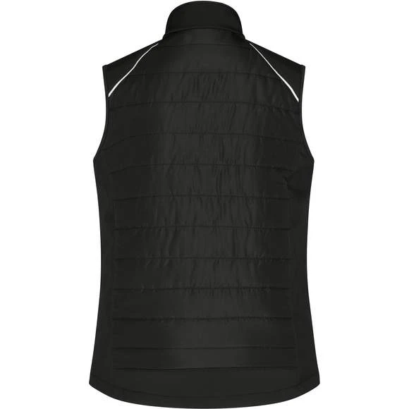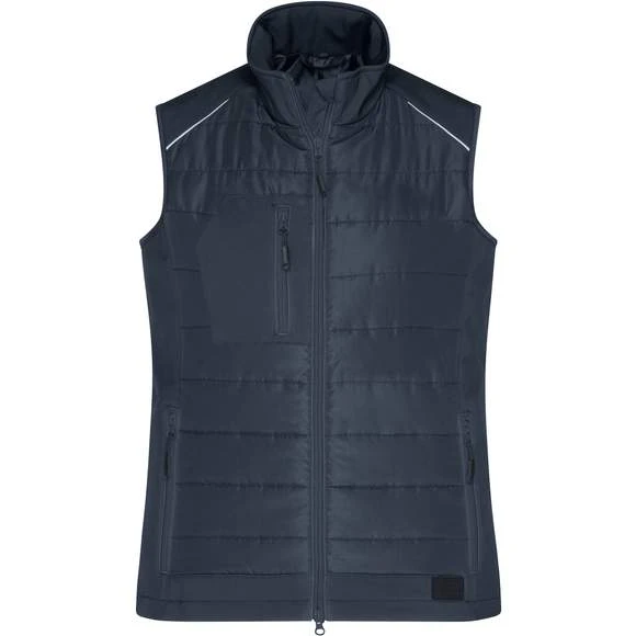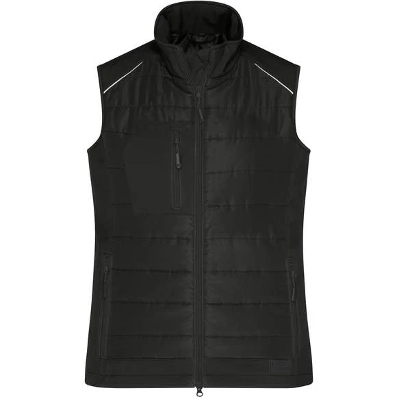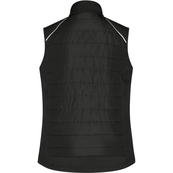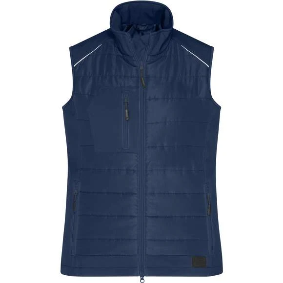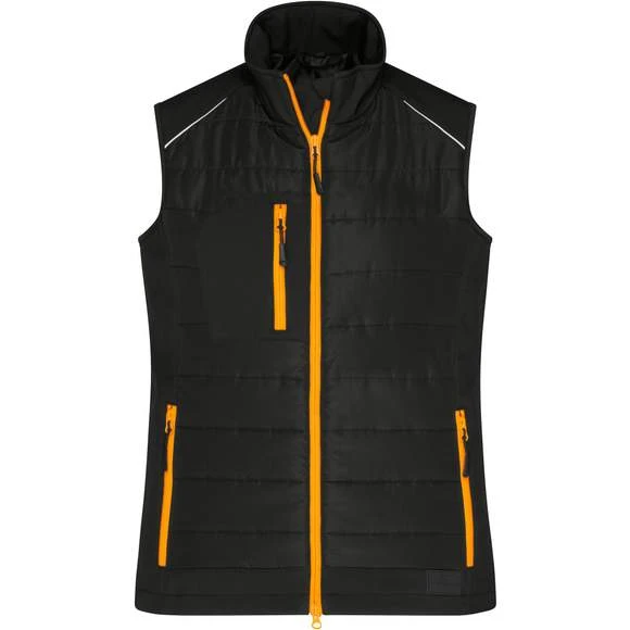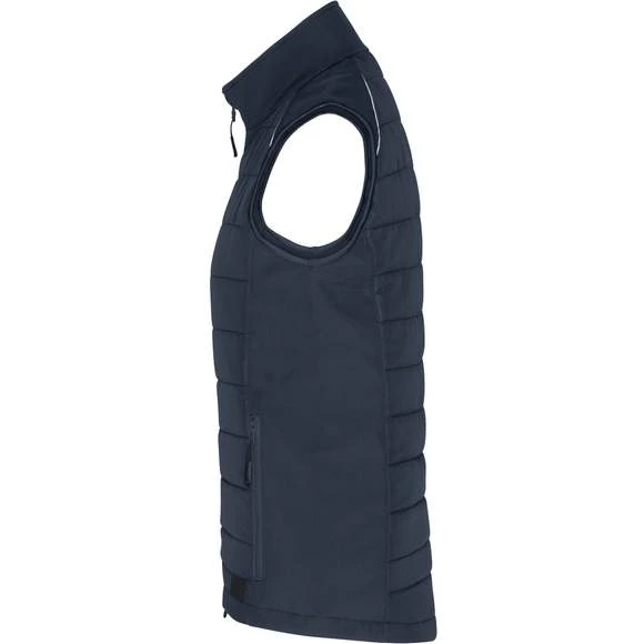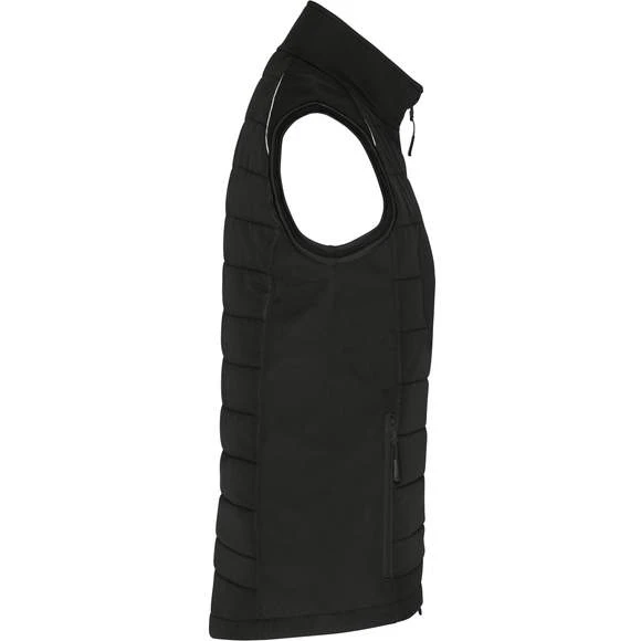 Gilet softshell sans manches pour femme, légèrement cintré, dans un mélange de matériaux double couche facile à entretenir, avec des empiècements matelassés à l’avant et à l’arrière, résistant à l’eau et à la saleté grâce à la finition bionic-finish®eco. Rembourrage chaud DuPont™ Sorona®, col montant et fermeture zippée double sens couverte sur toute la longueur avec protection contre le vent et protection du menton. Réglage de la largeur à l’ourlet. Poches latérales et poche poitrine avec fermeture zippée, poche intérieure avec fermeture auto-agrippante. Possède des éléments réfléchissants (sans fonction de protection / pas d’EPI) à l’avant et à l’arrière. Zip pour la décoration au dos. Composition : 100% polyester dont polyester recyclé. Grammage : 280g/m²