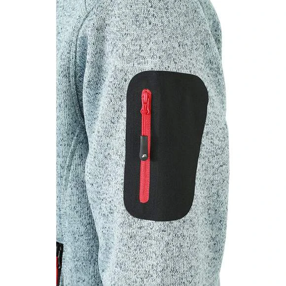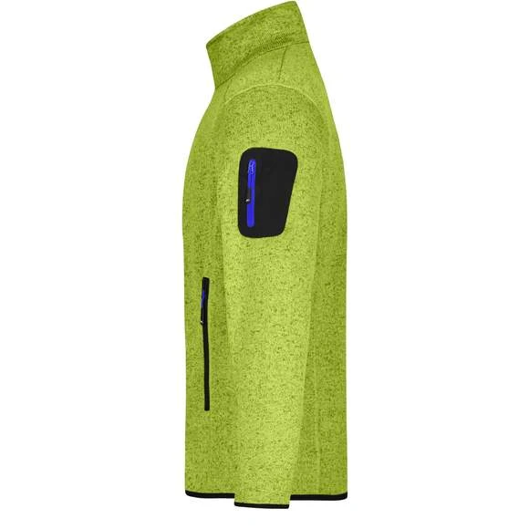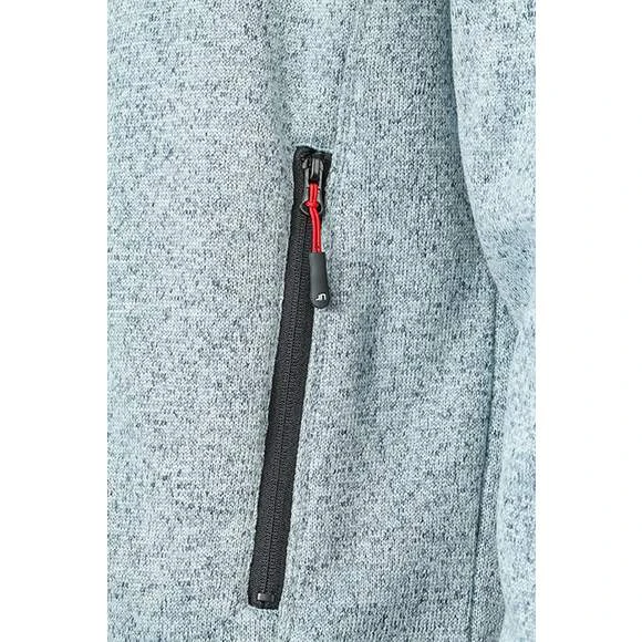 Veste polaire tendance avec col montant, en tissu doux, chaud et facile d’entretien, d’aspect chiné. L’extérieur est d’aspect tricoté, l’intérieur rugueux, doux et moelleux. Les coutures de séparation épousent la silhouette, les poches latérales sont zippées. Possède une bordure contrastante sur l’ourlet et les manches ainsi qu’une poche zippée sur la manche. Composition : 100% polyester. Grammage : 280g/m²