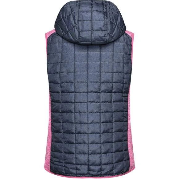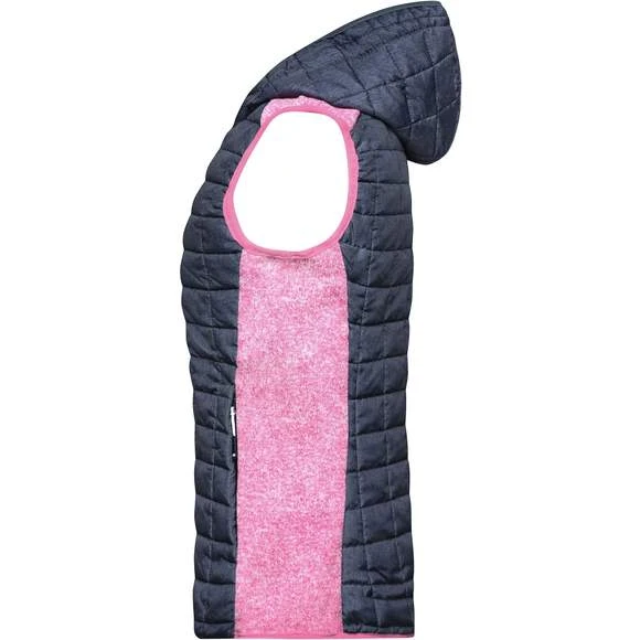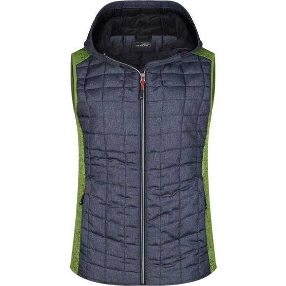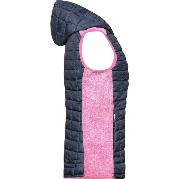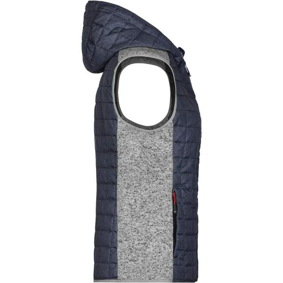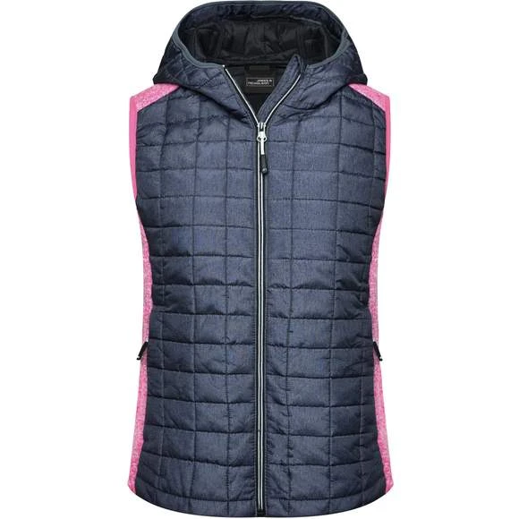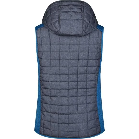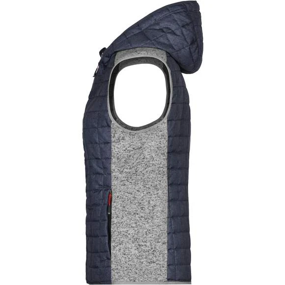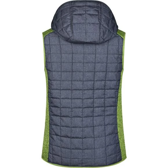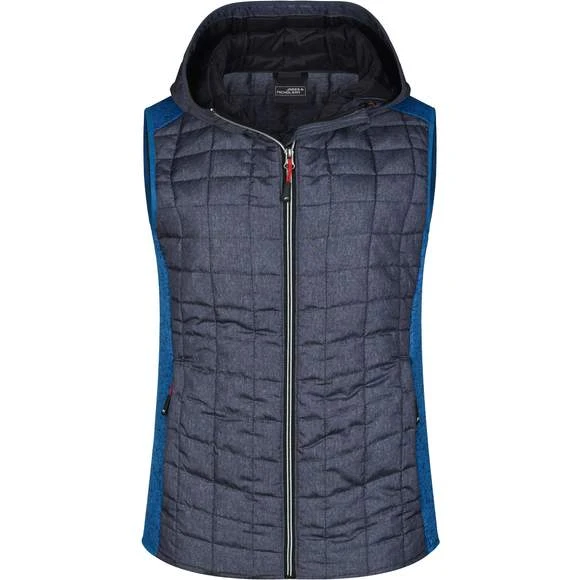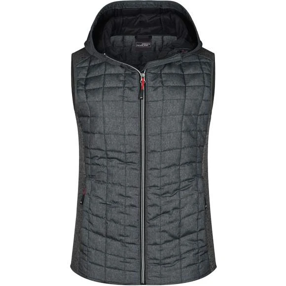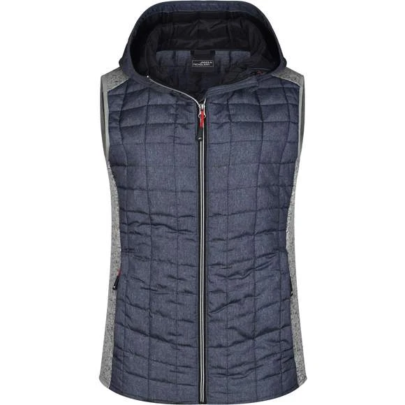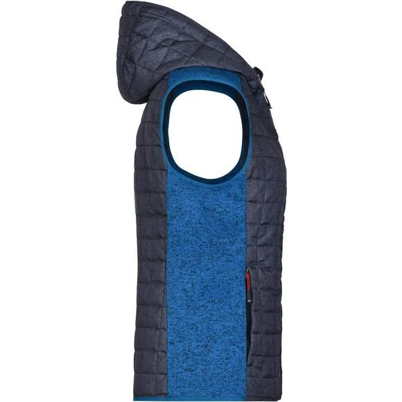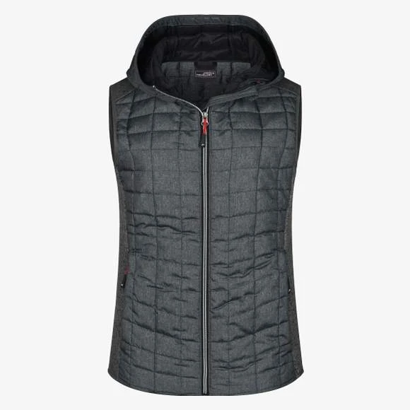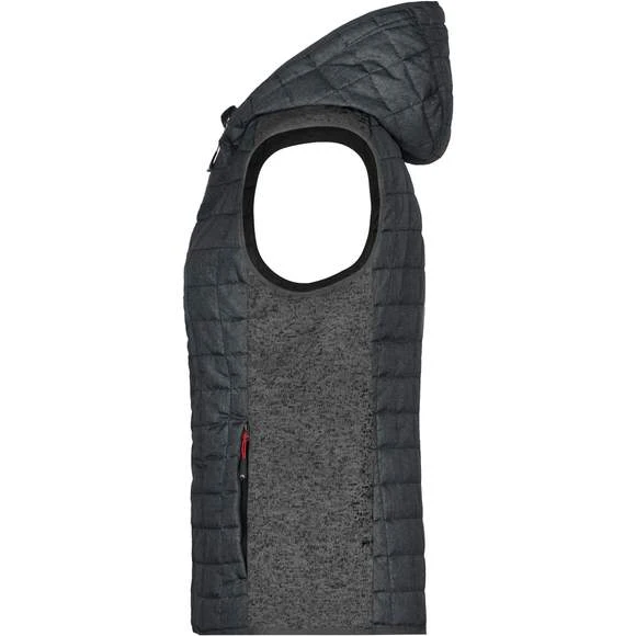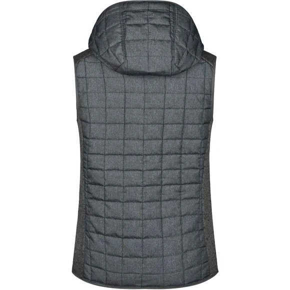 Veste sans manches pour femme, à coupe cintrée, en tissu doux, chaud et facile d’entretien, d’aspect chiné. L’avant, l’arrière et la capuche sont en motif à carreaux matelassés, la largeur intérieure de la capuche est réglable. Possède une fermeture zippée couverte sur toute la longueur, deux poches latérales zippées et deux poches intérieures. Composition : 100% polyester; doublure: 100% polyamide. Grammage : 280g/m²