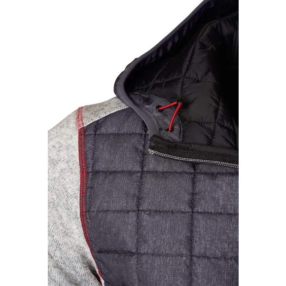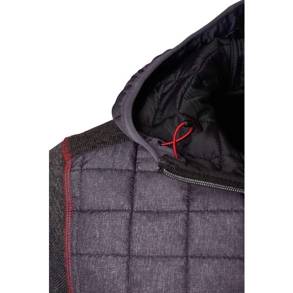 Veste pour homme, en tissu doux, chaud et facile d’entretien, d’aspect chiné. L’avant, l’arrière et la capuche sont en motif à carreaux matelassés, les coutures sont plates et contrastées sur les manches. La largeur intérieure de la capuche est réglable. Possède une fermeture zippée couverte sur toute la longueur, deux poches latérales avec fermeture zippée et deux poches intérieures. Composition : 100% polyester; doublure: 100% polyamide. Grammage : 280g/m²