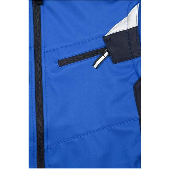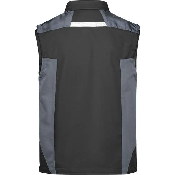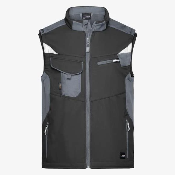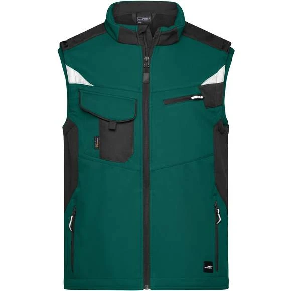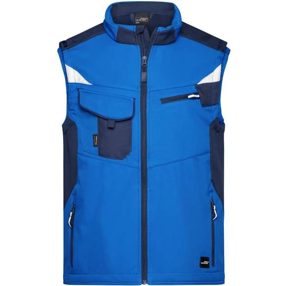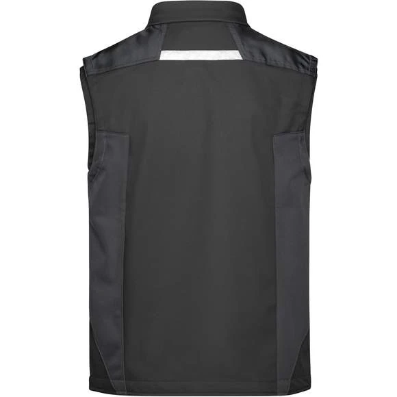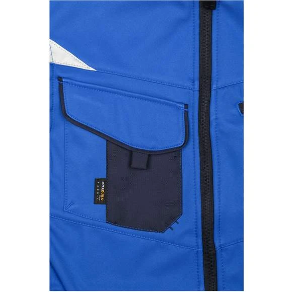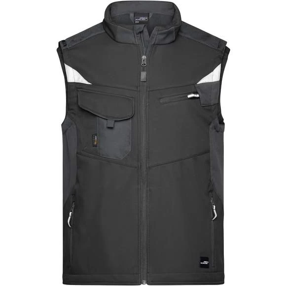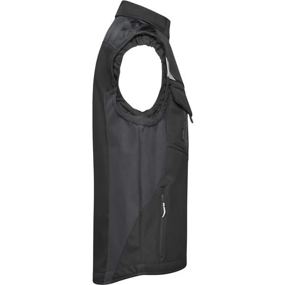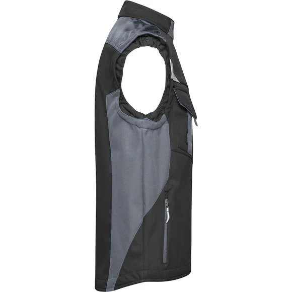 Gilet softshell professionnel sans manches, de haute qualité en matériau softshell robuste et durable, coupe-vent et hydrofuge (colonne d’eau de 2 000 mm), à propriété respirante et perméable à la vapeur d’eau (2000 g/m² /24h). Col montant, poignets élastiques. Zone des épaules renforcée par CORDURA®. Fermeture zippée couverte sur toute la longueur avec protection contre le vent. Possède de nombreuses poches : poches latérales; sur la poitrine avec fermeture zippée; poche poitrine avec rabat; poches intérieures. Éléments réfléchissants (sans fonction de protection/pas d’EPI) sur les emmanchures et le dos. Composition : 100% polyester. Grammage : 320g/m²