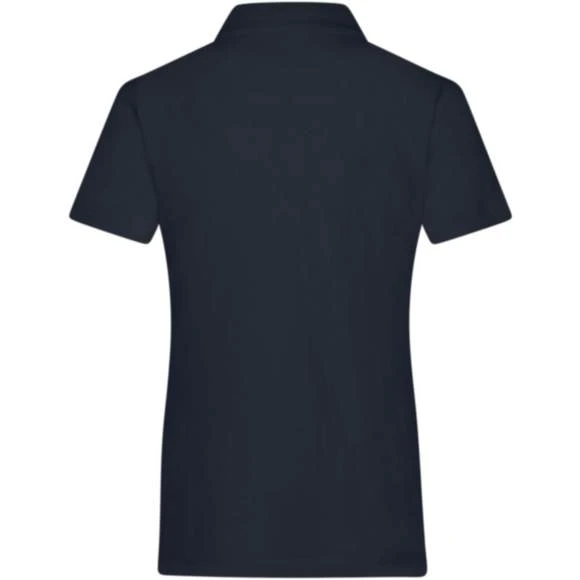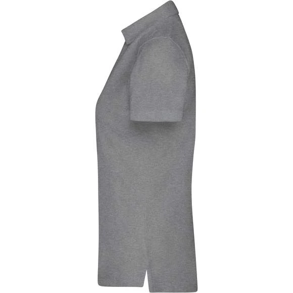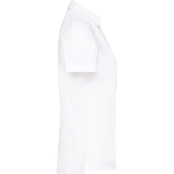 Polo pour femme, avec empiècement tendance, piqué fin classique, en coton peigné ringspun. Col prêt à porter. Motif au col, à l’intérieur de la patte de boutonnage et fentes latérales. 4 boutons de couleur contrastante. Demi-lune ton sur ton. Composition : 100% coton. Grammage : 195g/m²