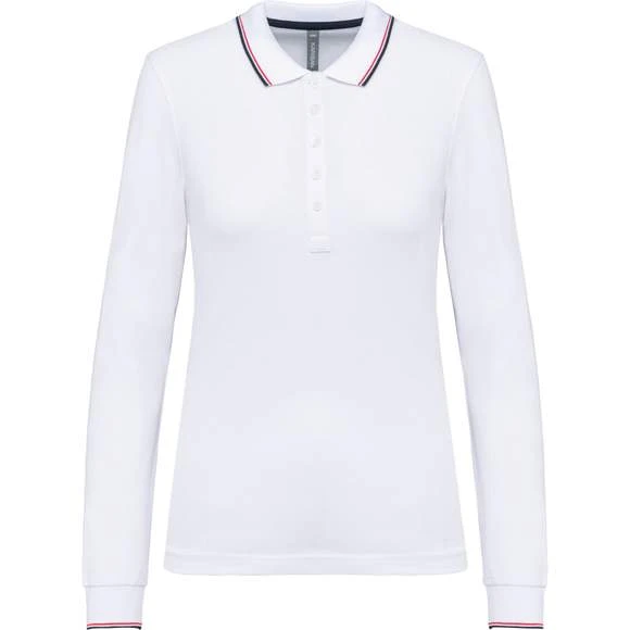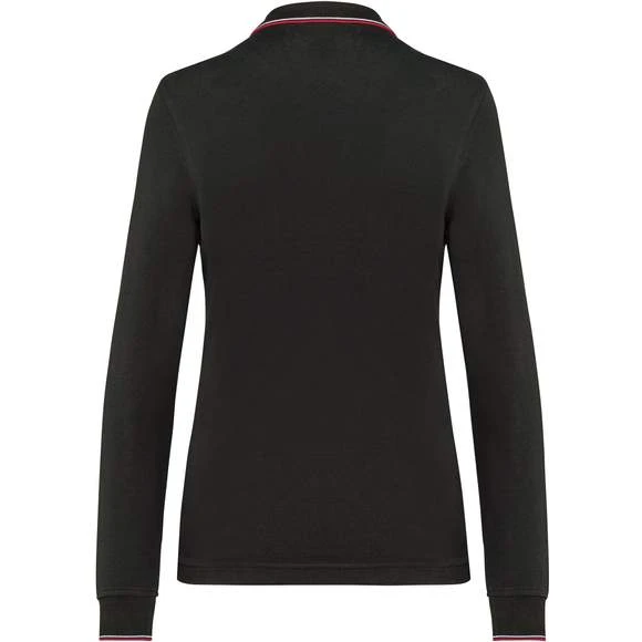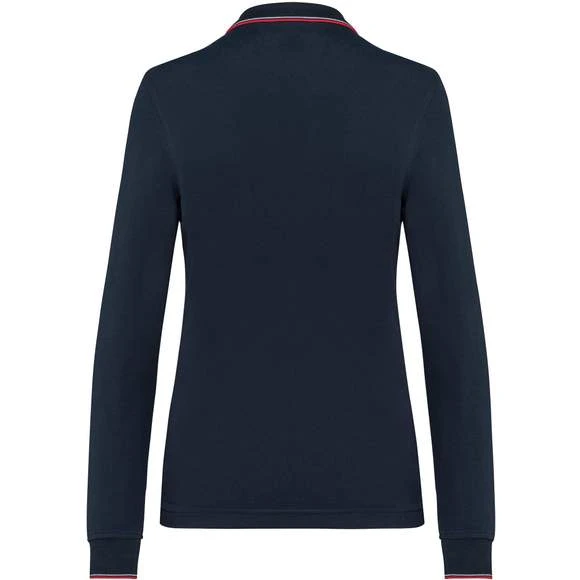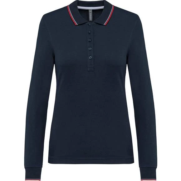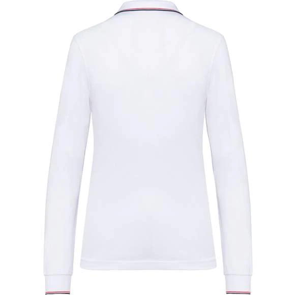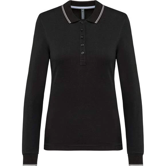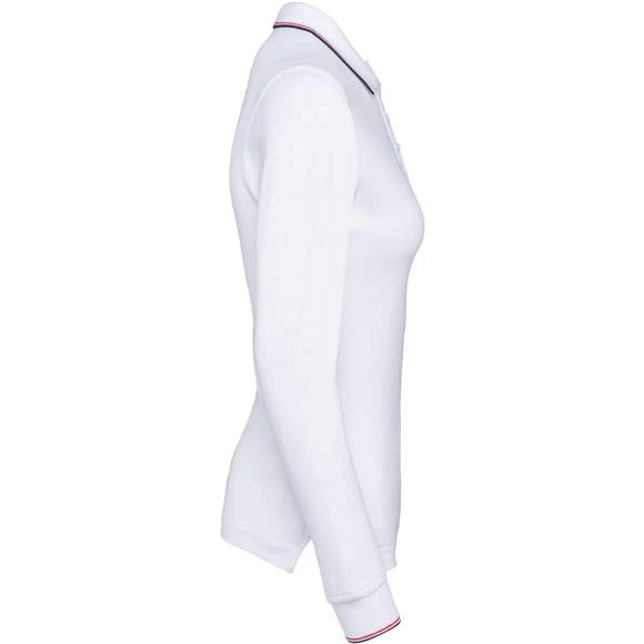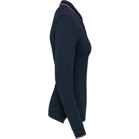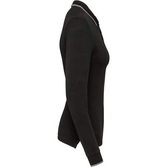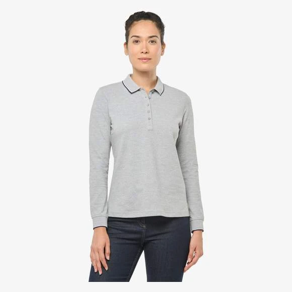 Polo maille piquée à manches longues pour femme. Coupe ajustée. Coton peigné. Maille piquée. Col 5 boutons ton sur ton. Renfort épaule en silicone pour un meilleur maintien. Bande de propreté contrastée encolure et fentes côtés en matière principale. Finition bord côte 1×1 avec liserés contrastés col et bas de manche. Finitions double surpiqûres bas de vêtement. Etiquette de marque au col ainsi qu’une puce de taille déchirables pour faciliter la personnalisation. Composition : 100% Coton (Sauf Coloris Oxford Grey : 90% coton et 10% viscose). Grammage : 220g/m²