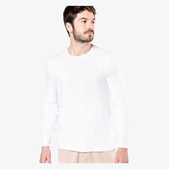 97% coton / 3% élasthanne. Coloris chinés 87% Coton / 9% Viscose / 4% Élasthanne. Encolure ronde. Finition double aiguille bas de manche et bas de vêtement. Avec sa coupe moderne et près du corps, il se rapproche des standards du prêt à porter. Grammage : 160g/m²