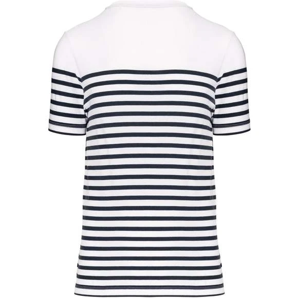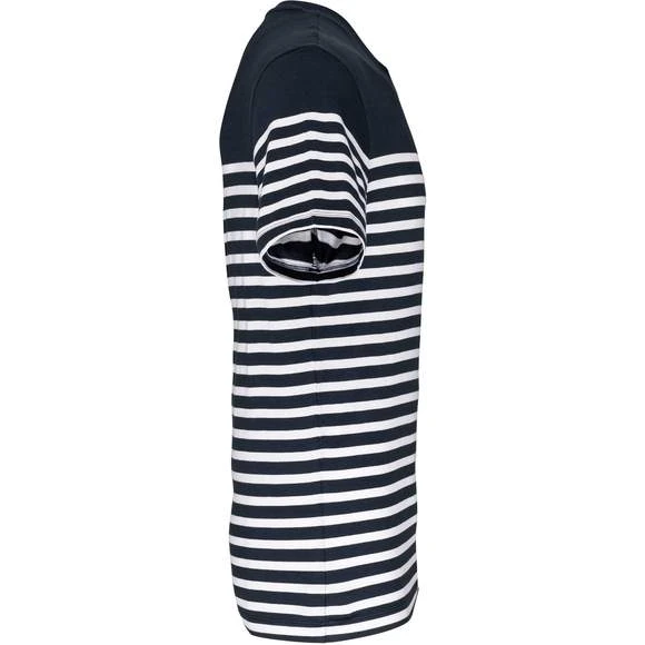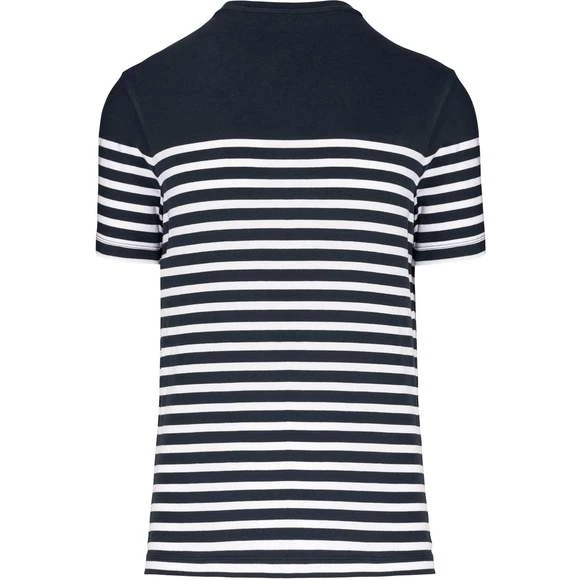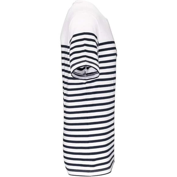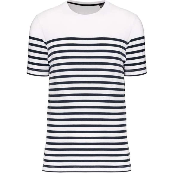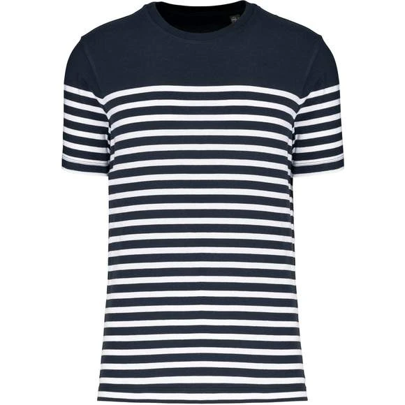 T-shirt marinière coupe droite. Lavage aux enzymes. Encolure ronde avec bord-côte 1×1. Rayures tricotées. Bande de propreté au col. Finition double aiguille bas de manches et bas du vêtement. Pas d’étiquette de marque pour faciliter la personnalisation. Composition : 100% coton. Ce t-shirt est conçu à partir de 100% de coton peigné biologique. Le certificat GOTS est délivré par Ecocert Greenlife. Grammage : 160g/m²