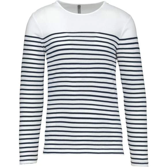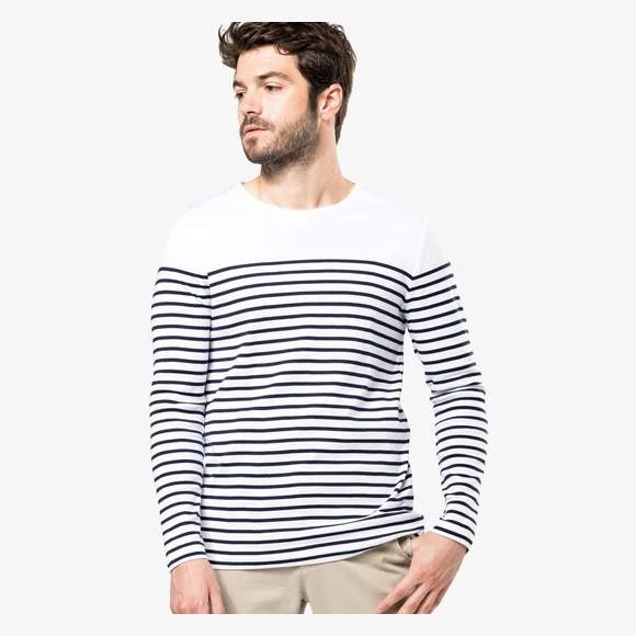 Marinière manches longues homme, 100% coton côte 1×1. encolure ronde. point fantaisie sur l’épaule. fentes latérales. Grammage : 220g/m²