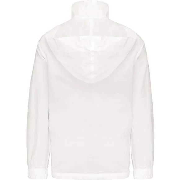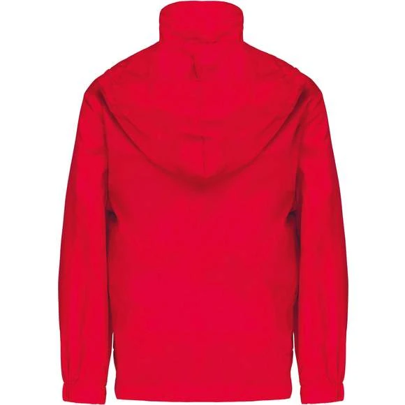 100% polyester. Fermeture zippée ton sur ton. Capuche dans le col avec patte auto-agrippante. 2 poches zippées devant. Bas de manches élastiqué. Repliable dans sa poche sur la base du système K-Way®. Grammage : 70g/m²