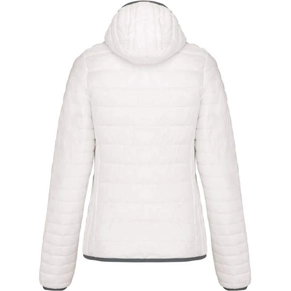 Doudoune légère capuche femme, 100% polyamide. garniture intérieure polyester. chaude et ultralégère. compressible dans son sac de rangement. 2 poches zippées devant. intérieur et capuche contrastés (sauf pour coloris navy). Grammage : 340g/m²