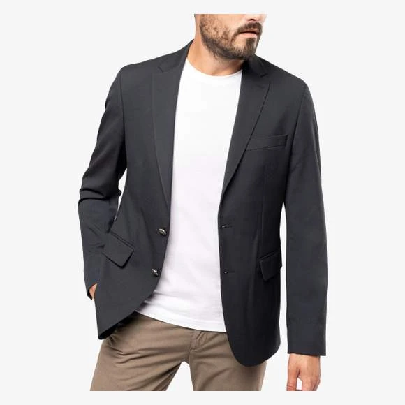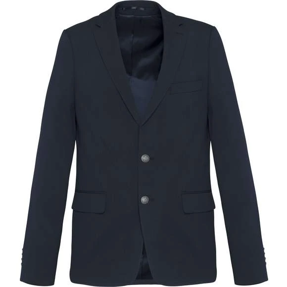 64% polyester / 34% viscose / 2% élasthanne. Doublure taffetas polyester. Veste avec 2 boutons métal motif blason. 2 poches passepoilées devant avec rabat et 1 poche poitrine. 2 poches intérieures contrastées, boutonnées et 1 poche téléphone contrastée. Bas de manches avec 4 boutons métal motif blason. 2 fentes d’aisance au dos. 1 zip invisible côté coeur pour accès personnalisation. Grammage : 220g/m²