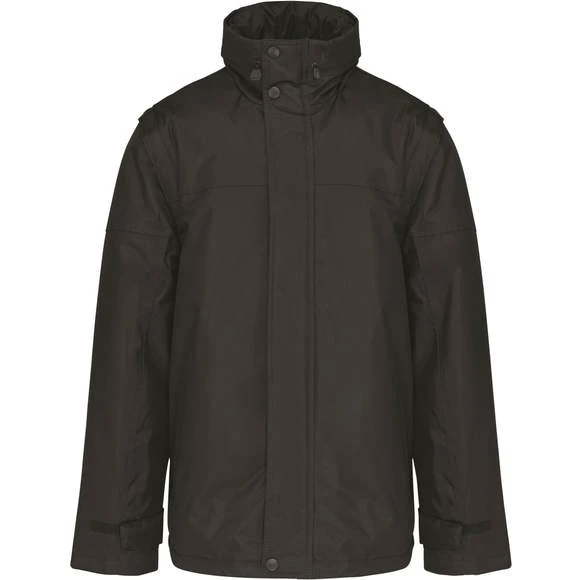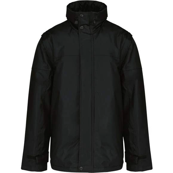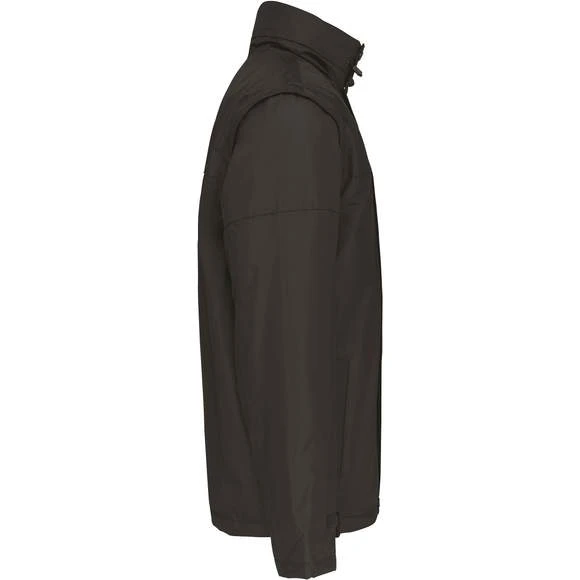 Manches amovibles. 2 poches latérales passepoilées. Cordon de serrage au bas avec stoppeurs. Grammage : 465g/m²