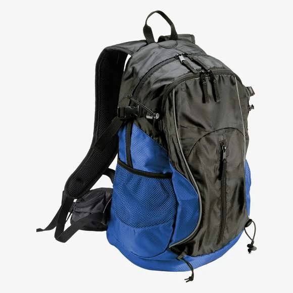Sac à dos multisports/randonnée en ripstop et polyester alvéolé, enduction PU conforme norme Reach, 2 compartiments interieurs, poche zippée devant, poches coté en filet, équipé d’un élastique porte baton, bretelles et ceinture ergonomiques, orifice prévu pour poche à eau. Accessoires conformes à la norme Reach en vigueur et zips SBS. Capacité : 30 l. Dimensions : 29 cm x 25 cm x 45 cm.