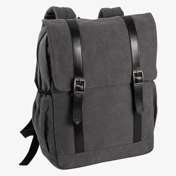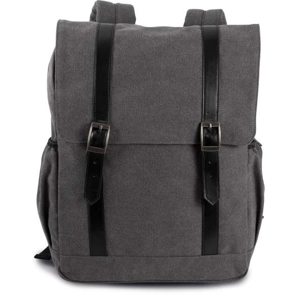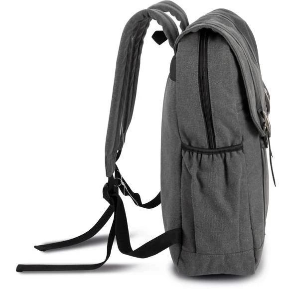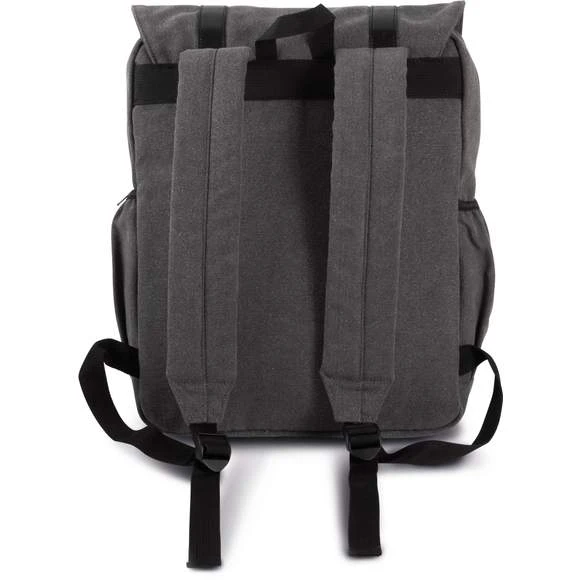 Sac à dos en toile de coton à rabat. Sangles contrastées avec fermeture à boucle métallique décorative et boutons pression. Compartiment intérieur zippé pouvant loger des tablettes et ordinateurs jusqu’à 13 ». Bretelles ergonomiques et dos matelassés. Dimensions : 29x13x40 cm. Grammage : 450g/m²