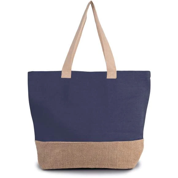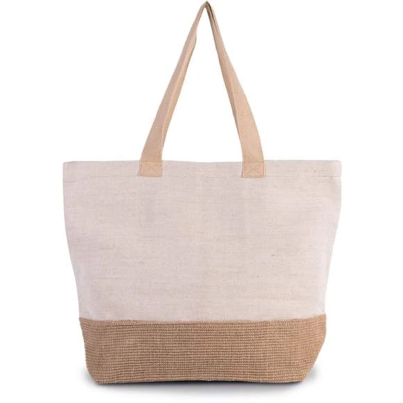 Grand sac shopping en coton et jute (juco) avec base de couleur contrastée en toile de jute. Le juco et la toile de jute apportent un tissage à aspect rustique. Poche intérieure zippée. Fermeture magnétique. Dimensions : 52x16x40 cm. Grammage : 500g/m²