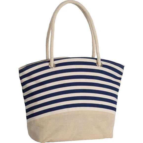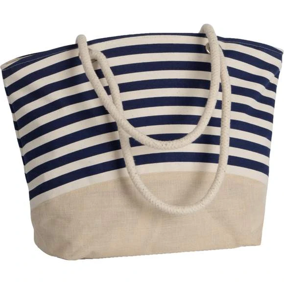 Sac shopping/ Sac à main, avec imprimé marinière, en coton canvas et jute. Anses en coton avec cordelette intérieure en coloris naturel. Poche interne. Fermeture zippée.