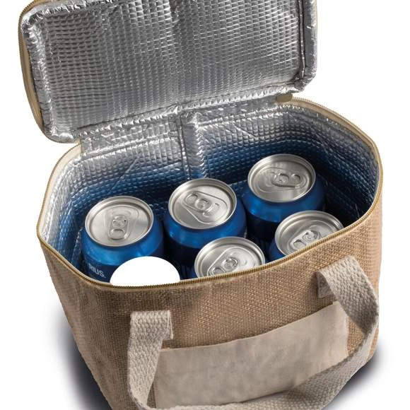 Sac isotherme avec extérieur en toile de jute et poche en coton pour faciliter la personnalisation, intérieur isotherme avec paroi isolante en aluminium et mousse isotherme haute densité. Poignées en coton. Petit modèle. Dimensions : 20x15x15 cm.