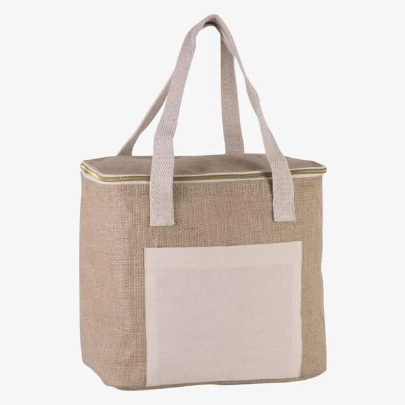 Sac isotherme avec extérieur en toile de jute et poche en coton pour faciliter la personnalisation, intérieur isotherme avec paroi isolante en aluminium et mousse isotherme haute densité. Poignées en coton. Modèle moyen. Dimensions : 28x17x25 cm.