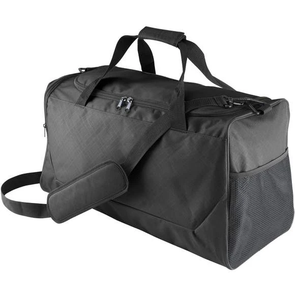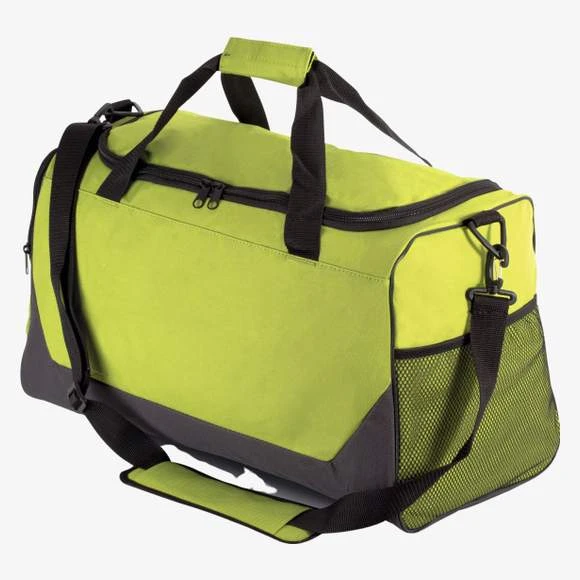 Sac de sport en polyester 600D enduction PVC. 2 poches cotĂ©, une en filet, une pour rangement chaussures, lanière d’Ă©paule amovible. Zips SBS. Dimensions : 55 x 32 x 26 cm.