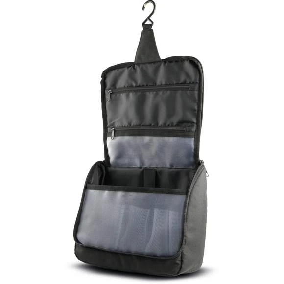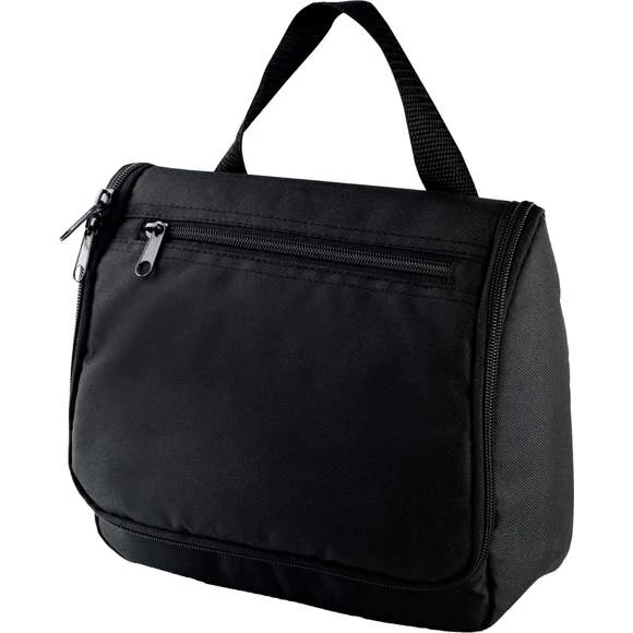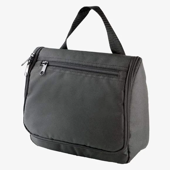 Trousse de toilette en polyester 600D conforme norme reach, ouverture zippée sur rabat devant, compartiments interieurs en filet, crochet de suspension à l’interieur. Accessoires conformes à la norme reach. Capacité : 4 litres. Dimensions : 23 cm x 8 cm x 19 cm/