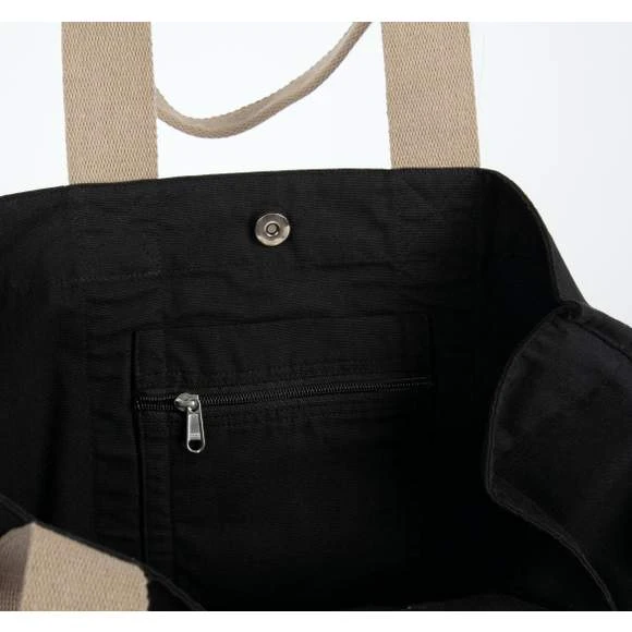 Grand sac shopping composé de coton recyclé et de polyester recyclé. Le certificat GRS (Global Recycled Standard) est délivré par Ecocert Greenlife. Les anses de couleurs contrastées cousues tout le long du corps du sac apportent une touche d’originalité et une plus grande résistance. Le sac possède une poche intérieure avec fermeture zippée pour ranger en toute sécurité clés et téléphone. Fermeture à bouton magnétique. Dimensions : 44 x 22 x 38 cm. Capacité : 36 litres. Composition : coloris Black Night 67% coton / 30 % polyester/ 3% autres fibres. Coloris Ecume 75% coton / 22% polyester/ 3 % autres fibres. Grammage : 285g/m²