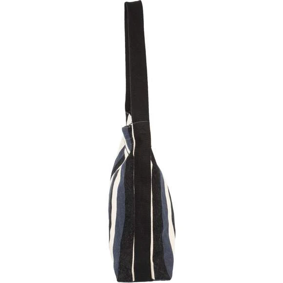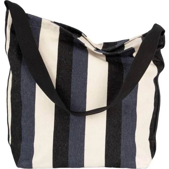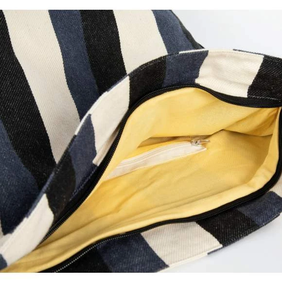 Sac bandoulière rayé en tissu recyclé. L’intérieur du sac est doublé avec un tissu de couleur contrasté et possède une fermeture zippée. Le sac est doté d’une poche interne zippée. L’anse d »une largeur de 4 cm apporte plus de confort. Le tissu sergé rayé confère un aspect unique à chaque pièce. Dimensions : 45 x 13 x 39 cm. Composition : 78% coton recyclé / 20% polyester recyclé / 2% autres fibres. Le certificat GRS (Global Recycet led Standard) est délivré par Ecocert Greenlife. Grammage : 300g/m²