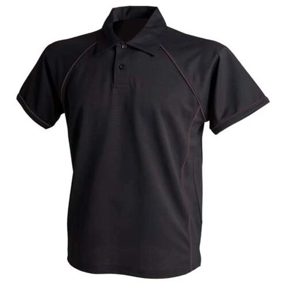 Maille piquée en 100% polyester COOL PLUS pour le controle et l’evaporation de la transpiration. Manches raglan et finition passepoil blanc. Col 2 boutons ton sur ton. Grammage : 210g/m²