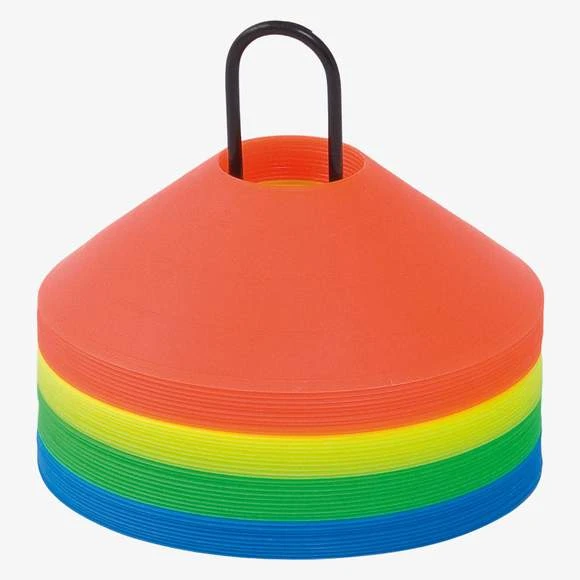 Kit de délimitation conique avec support de transport. Jeu de 40 cônes (10 pièces x 4 coloris différents) de 5 cm de hauteur.