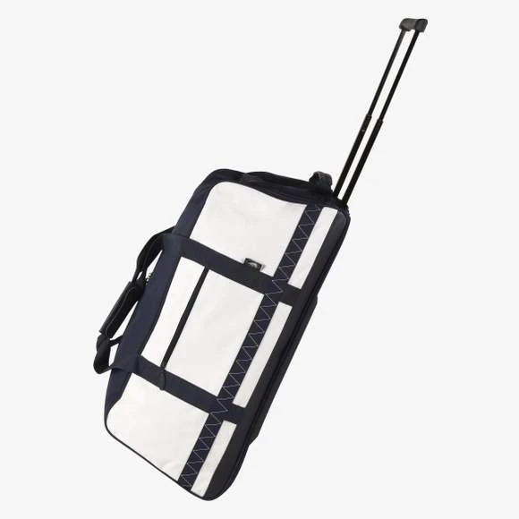 Sac de voyage à roulettes en 100% polyester 600D. 1 poche frontale avec zip. 1 poche latérale avec zip pour chaussures ou maillot de bain. 1 poche intérieure avec zip. Bandoulière ajustable et protection ajustable. Surpiqûres zig zag contrastées. Poignée rétractable et roulettes résistantes. 63x30x28