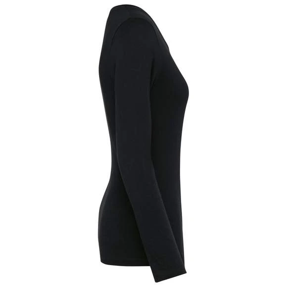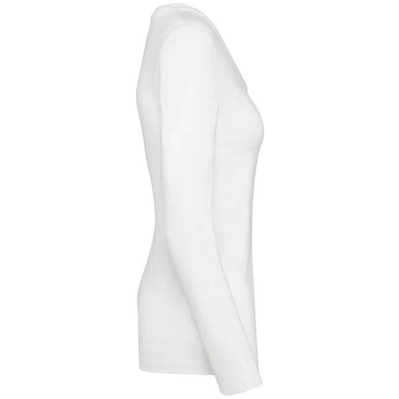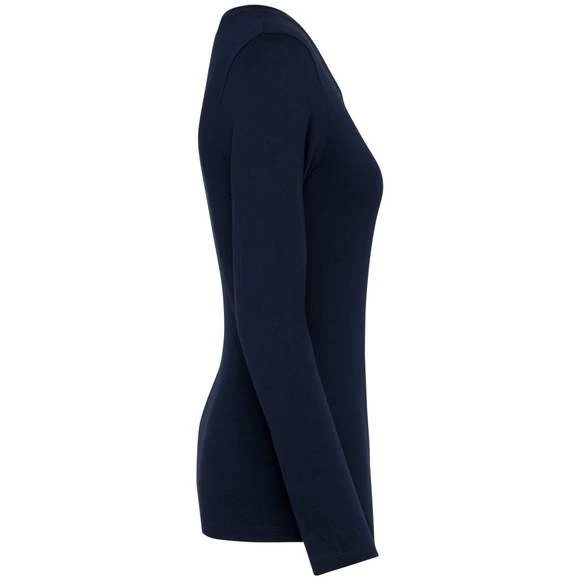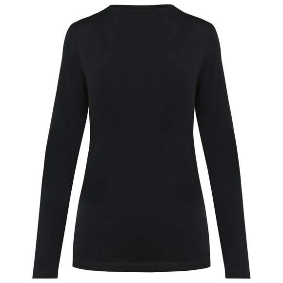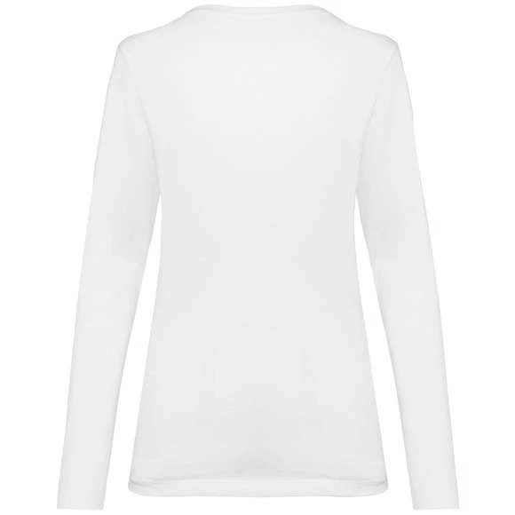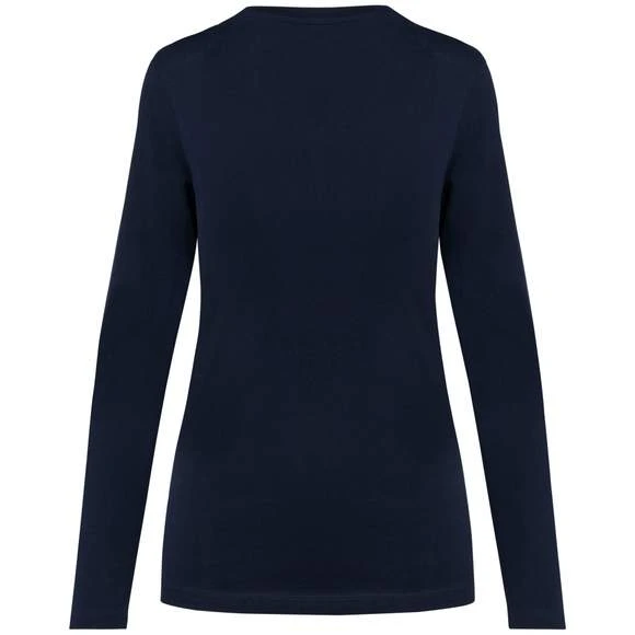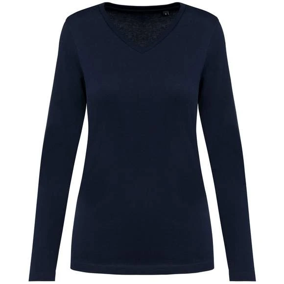 Tee-shirt à manches longues, col V pour femme. Maille en coton peigné Supima®. Tissu jersey d’une grande finesse et de qualité au toucher doux et soyeux. Construction coupée cousue. Encolure col V avec bande de propreté ton sur ton. Renfort de la couture épaule avec une bande siliconée. Finition bas de manches et bas de vêtement avec ourlet double surpiqûre. Pas d’étiquette de marque au col, uniquement une puce de taille. Composition : 100% coton. Grammage : 190g/m²