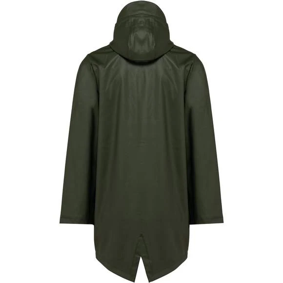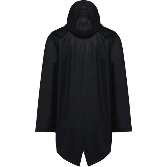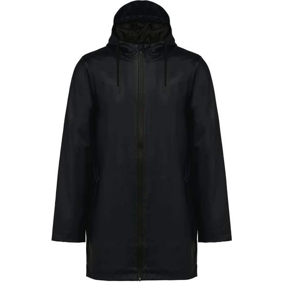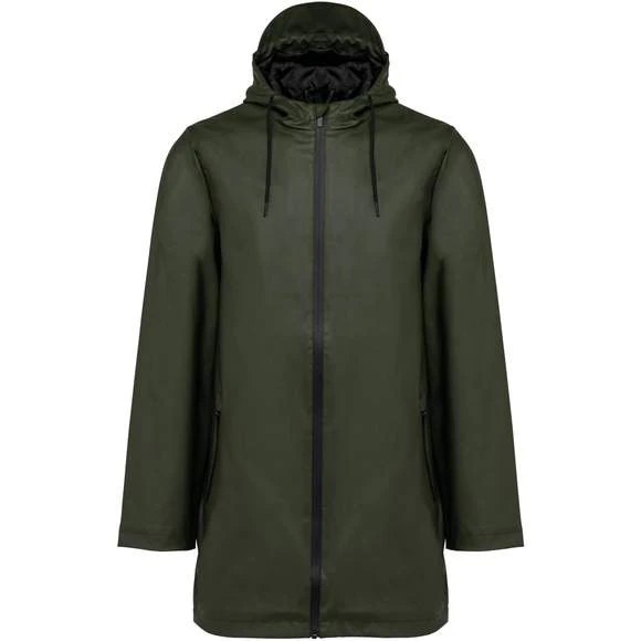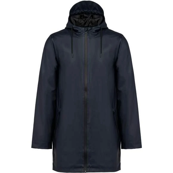 Veste de pluie unisexe. Coutures thermosoudées. Imperméable 5000 mm. Doublure 100% polyester. Capuche avec visière et cordon de serrage, stopper finition métal. Fermeture zippée reverse imperméable jusqu’au col, avec cache zip en haut. 2 poches latérales avec fermeture éclair imperméable et cache-zip. Œillets d’aération au niveau des aisselles. Dos plus long, doté d’une fente d’aisance en bas. Loop à l’intérieur du col pour accroché la veste. Patch de personnalisation à l’intérieur sur le haut du dos. Zips de personnalisation à l’intérieur, bas du dos et côté cœur. Pas d’étiquette de marque, uniquement une puce de taille. Composition : 100% enduction polyuréthane couche extérieure et 100% polyester couche intérieure. Grammage : 210g/m²