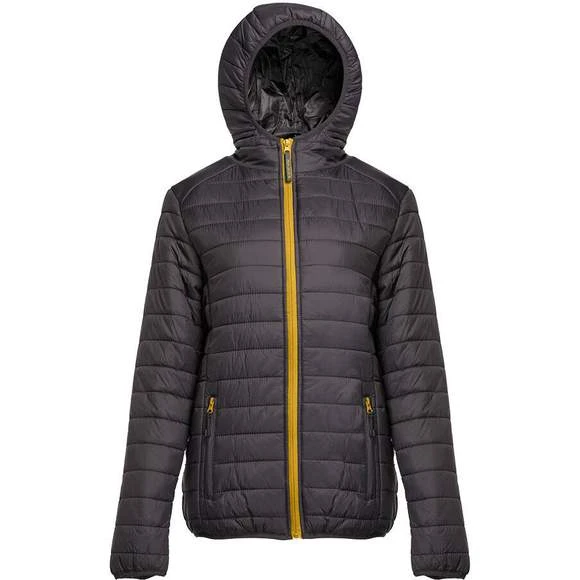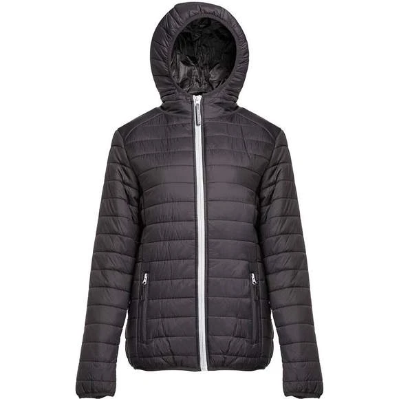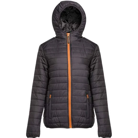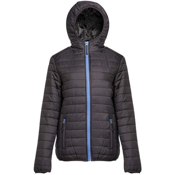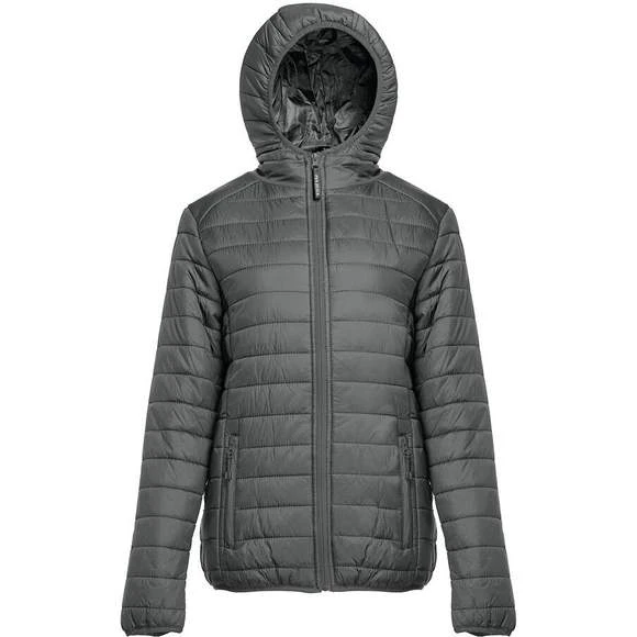 Doudoune légère femme, avec capuche. Coupe-vent. 2 poches latérales avec languette. Grande poche intérieure zippée. Poche intérieure bande auto-agrippante. Poignets et ourlet élastiqués.