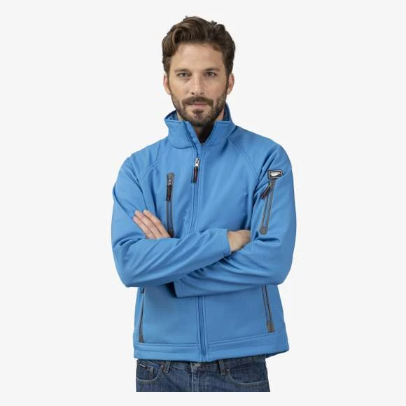 Blouson homme Soft Shell ultra léger. 95% polyester/5% élasthanne. Tissu contrecollé 3 couches avec membrane respirante et imperméable. Intérieur en micropolaire. 4 poches extérieures zippées. Elastique bas avec stoppers.