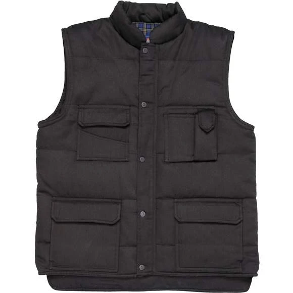 Bodywarmer avec multiples poches : poche pour stylo , poche sur le torse , poches à fermeture par bande auto-agrippante à l’avant , poche intérieure. 65% polyester 35% coton. Doublure 100% coton tartan. Grammage : 190g/m²