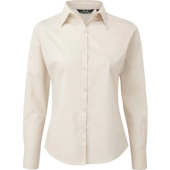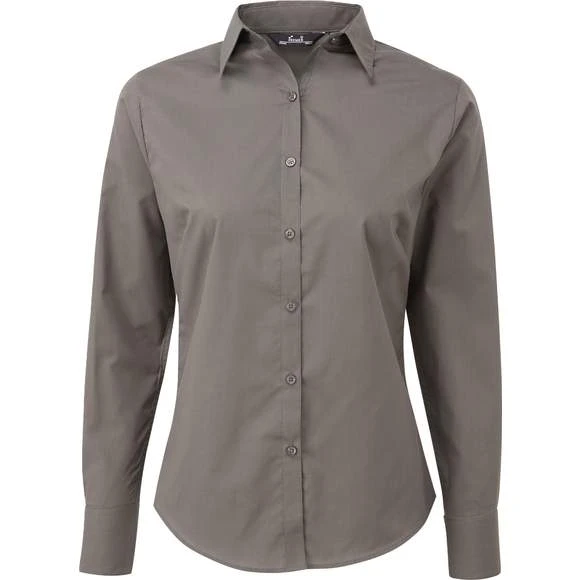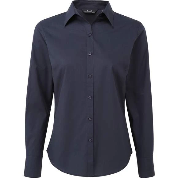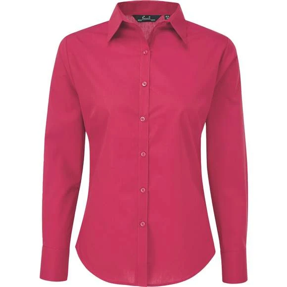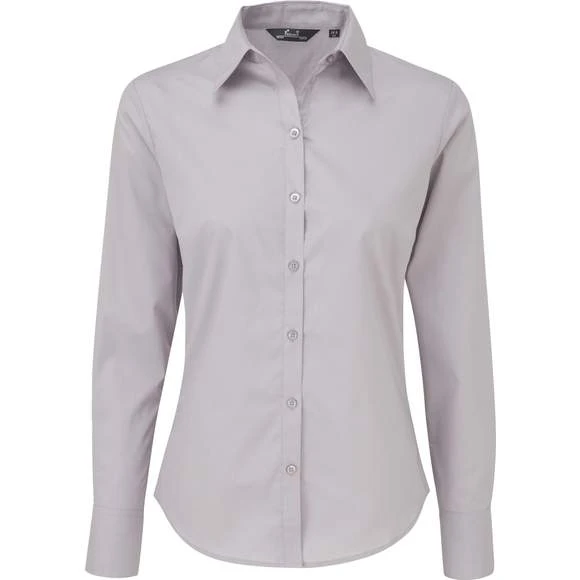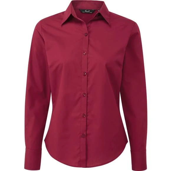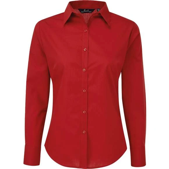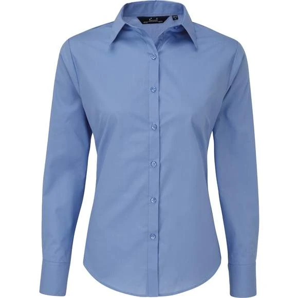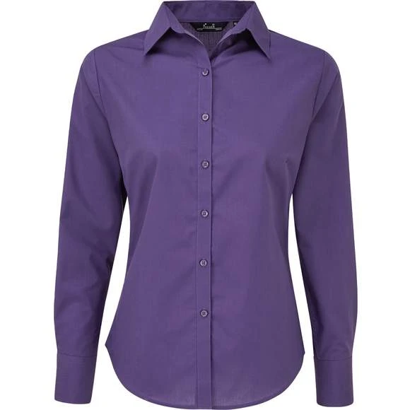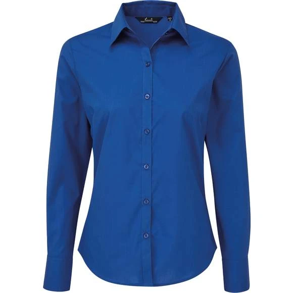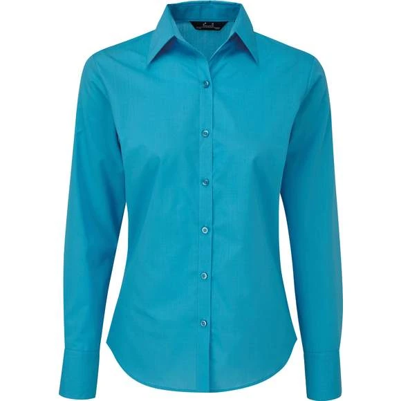 Chemisier popeline manches longues. Col non rigide. Bas arrondi. Coupe ajustée avec pinces au poignet et au dos. Entretien facile. Boutons nacre sur les chemises bleu clair (Light Blue) et blanc (White). Boutons ton sur ton sur les chemises d’autres coloris. 65% Polyester, 35% Coton, popeline simple. Grammage : 105g/m²