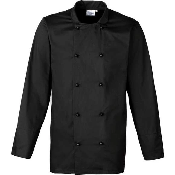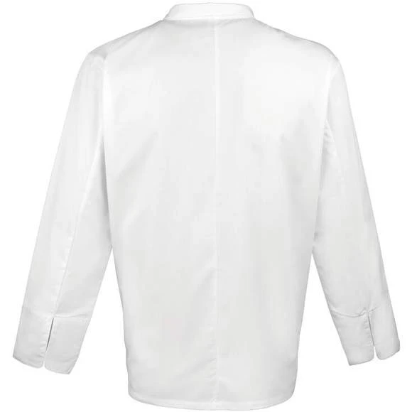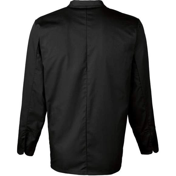 Veste de cuisinier manches longues. Col Mao avec surpiqûre. Fermeture cache-coeur avec 10 boutonnières. Boutons-pression noir (Black) en plastique inclus (autres couleurs disponibles, voir PR652). Poignets repliables avec fentes. Tailles unisexes. Doux au toucher. Lavage domestique 60°C. 65% Polyester, 35% Coton Sergé. Grammage : 195g/m²