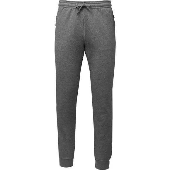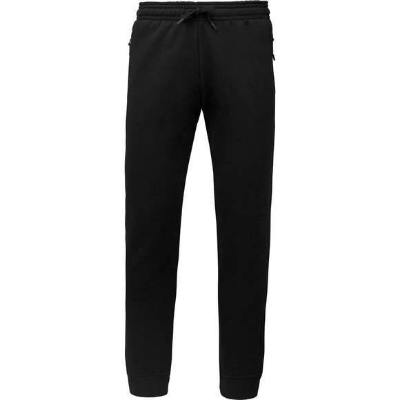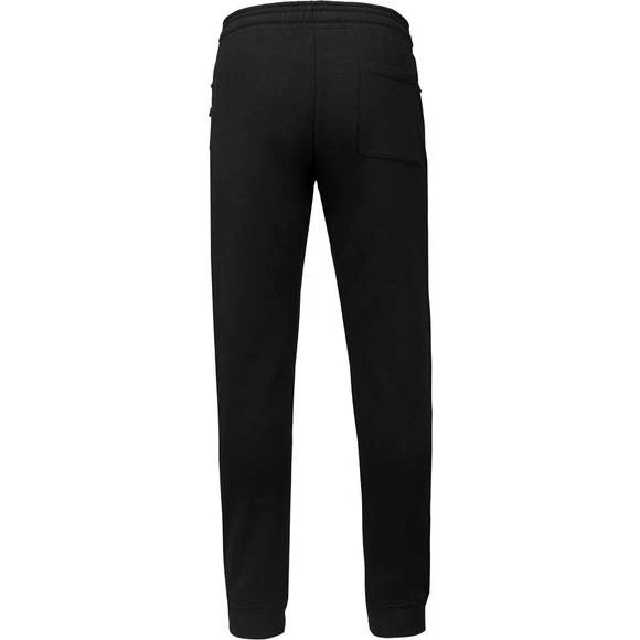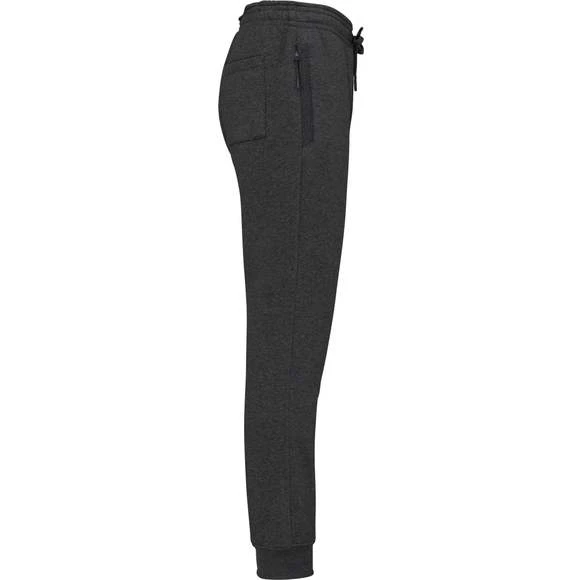65% polyester / 35% coton. Molleton gratté. Ceinture élastiquée avec cordon de serrage ton sur ton. Pour plus de confort, finition intérieur taille par bande élastique au touché doux, contrastée avec liseré fluorescent. 2 poches côtés fantaisie avec fermeture à glissière, sac de poche en maille filet et une poche téléphone contrastée fluorescente. 1 poche plaquée arrière. Bas de jambe reserré par un bord-côte 2 x 2. Grammage : 280g/m²