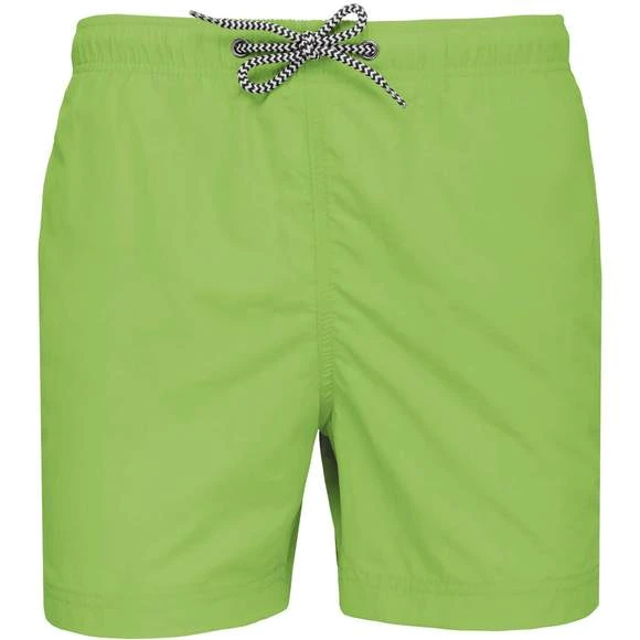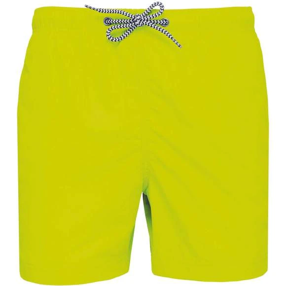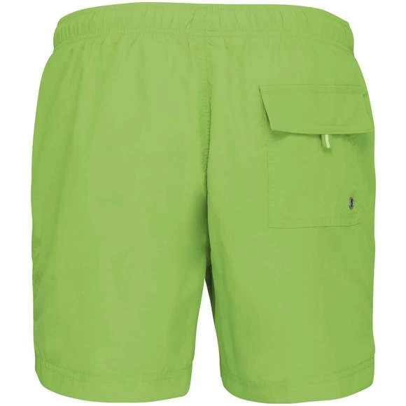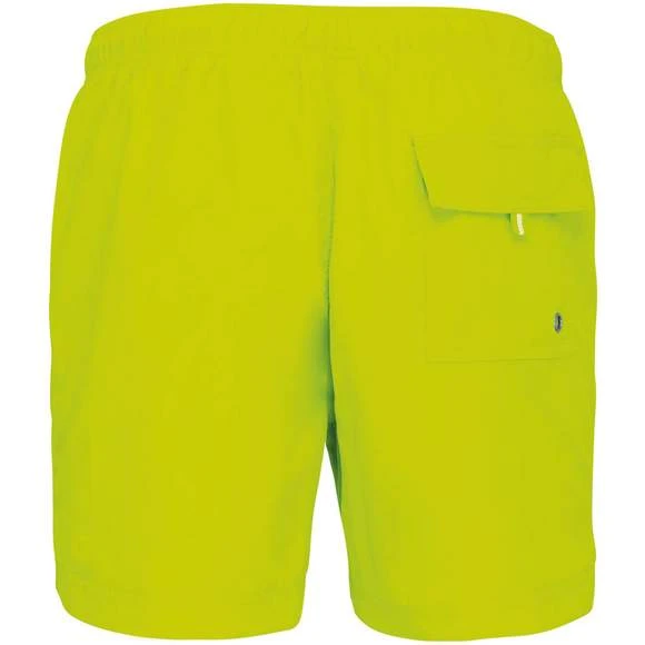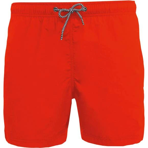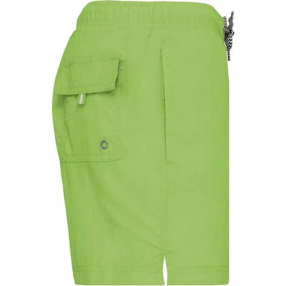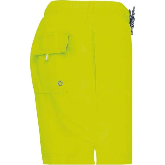 Extérieur : 100% polyamide 105g/m². Slip intégré en maille filet 100% polyester 65g/m². Doublure ceinture polycoton 80g/m². Tissu léger et à séchage rapide. Coupe mode. 2 poches latérales et 1 poche arrière avec oeillet, rabat et bande auto-agrippante. Ceinture intérieure fantaisie et élastiquée avec cordon de serrage. Grammage : 105g/m²
