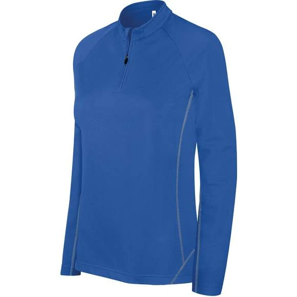 Sweat running 1/4 zip femme : 100% polyester polytricot. Manches raglan. Surpiqûres contrastées. Grammage : 170g/m²