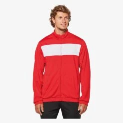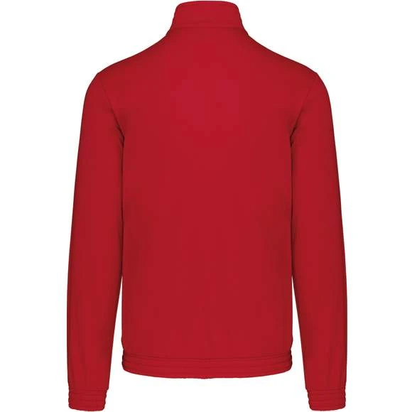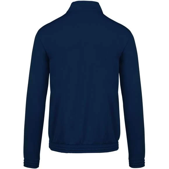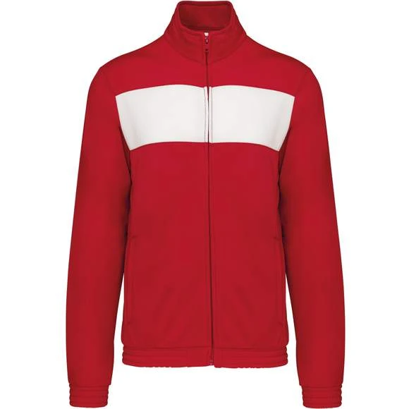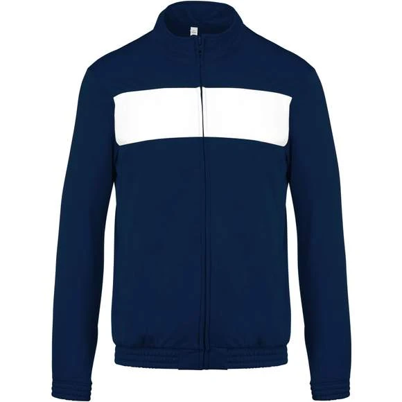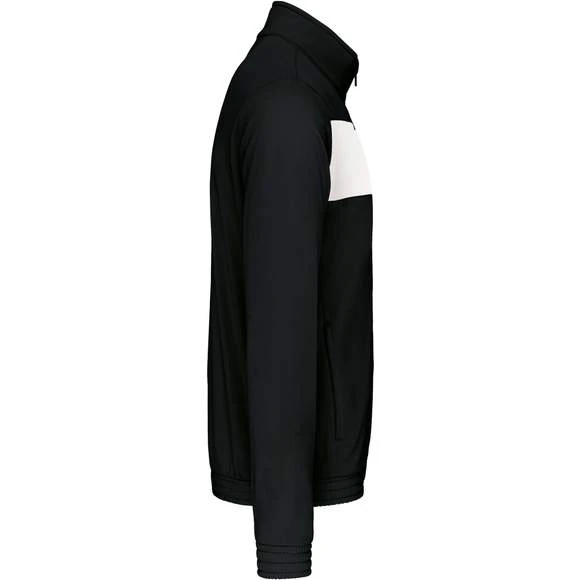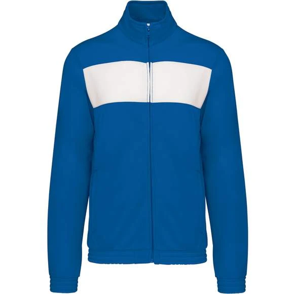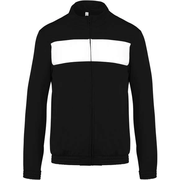 100% polyester tricot. Fermeture zippée. Empiècement poitrine contrasté. 2 poches latérales zippées. Bas de manches et de vêtement élastiqués. Coupe ajustée moderne. Grammage : 210g/m²