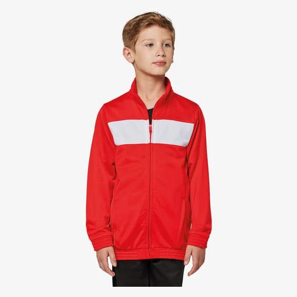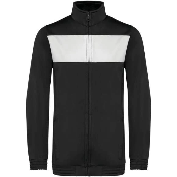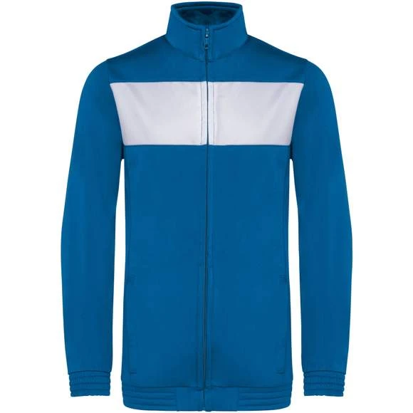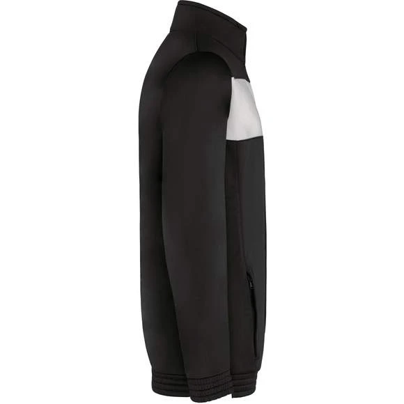 100% polyester tricot. Fermeture zippée. Empiècement poitrine contrasté. 2 poches latérales zippées. Bas de manches et de vêtement élastiqués. Coupe ajustée moderne. Grammage : 210g/m²
