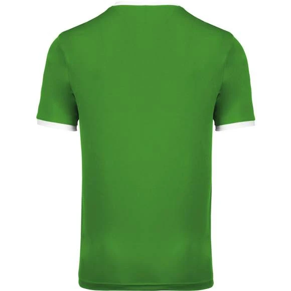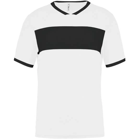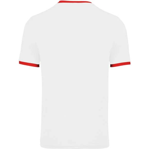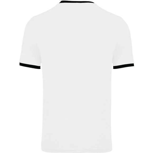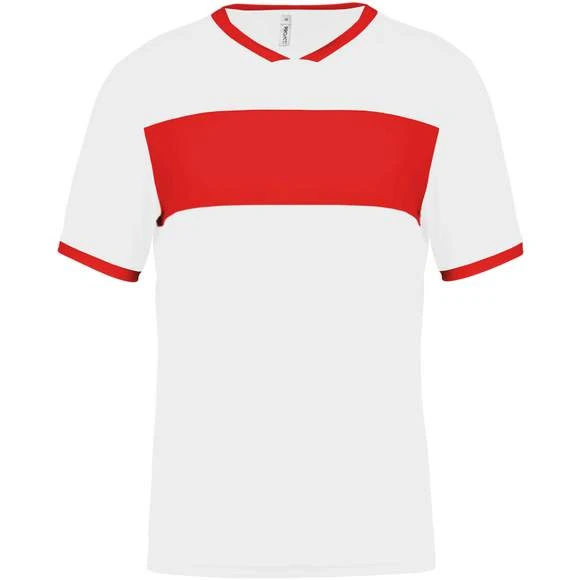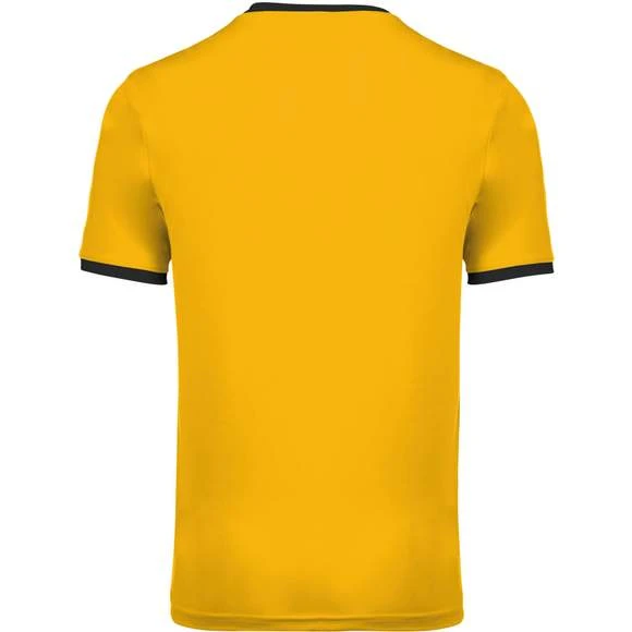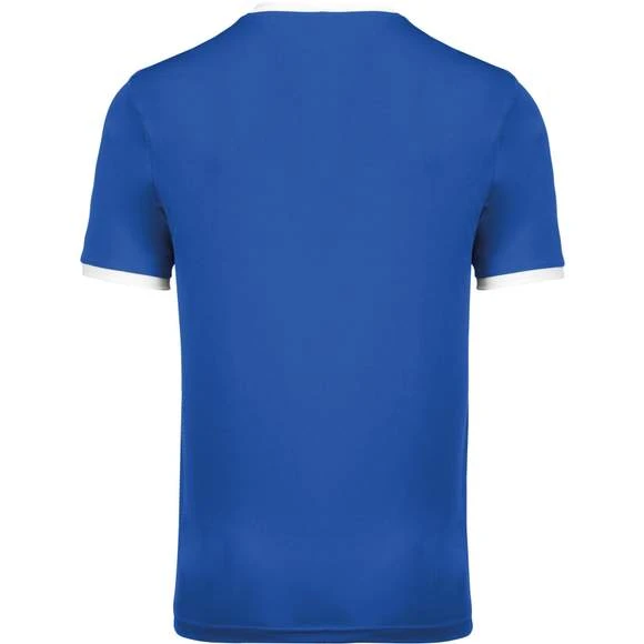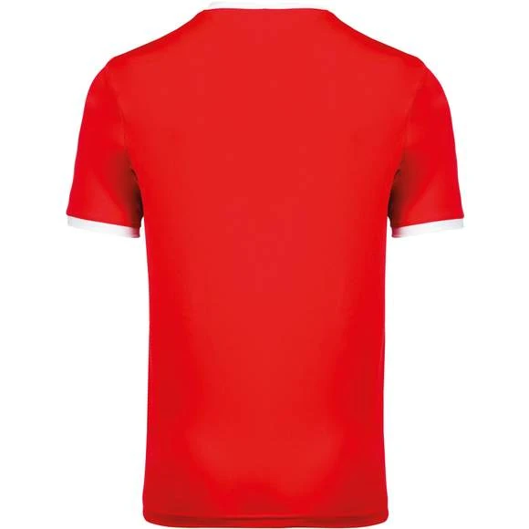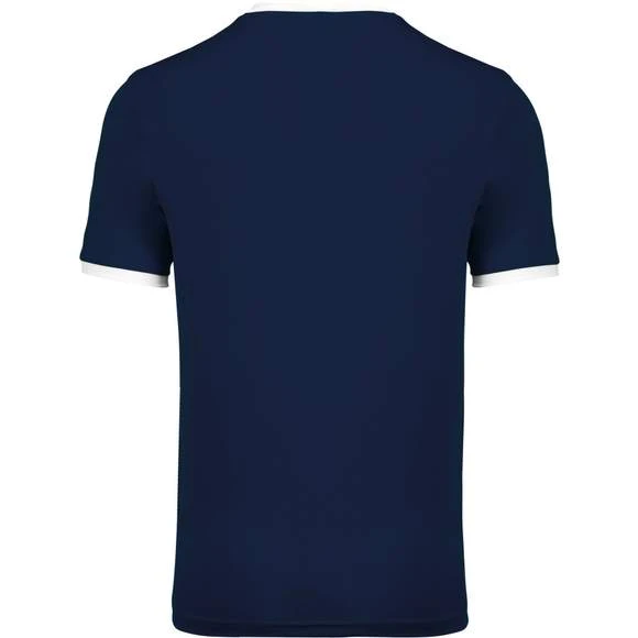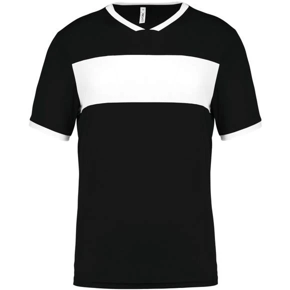 100% polyester. Maille interlock. Tissu à séchage rapide. Col en V avec bande de propreté. Manches montées. Empiècements poitrine, col et bas de manches contrastés. Grammage : 135g/m²