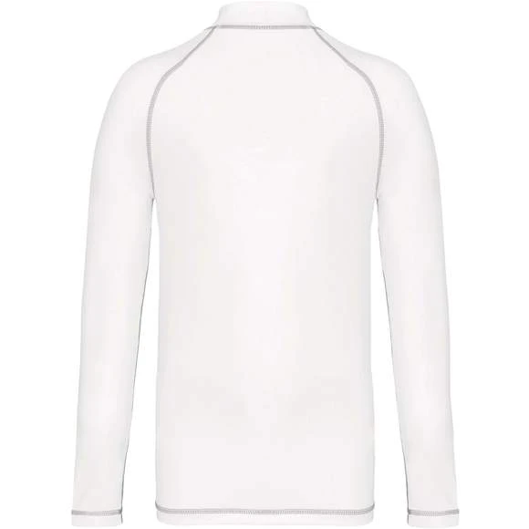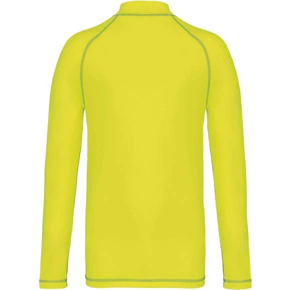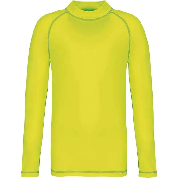 Tee-shirt technique à manches longues. Modèle pour enfant spécialement conçu pour le sport. Maille extensible. Coupe skinny. Protection UV50+ correspondant à la norme EN13758-1&2. Manches longues raglan avec surpiqûres contrastées. Col montant. Boucle élastique insérée dans l’ourlet devant permettant de passer le cordon du short afin de stabiliser le t-shirt. Finition double aiguilles aux manches et bas de vêtement. Etiquette de marque déchirable pour faciliter la personnalisation. Composition : 88% polyester recyclé et 12% élasthanne. Grammage : 160g/m²
